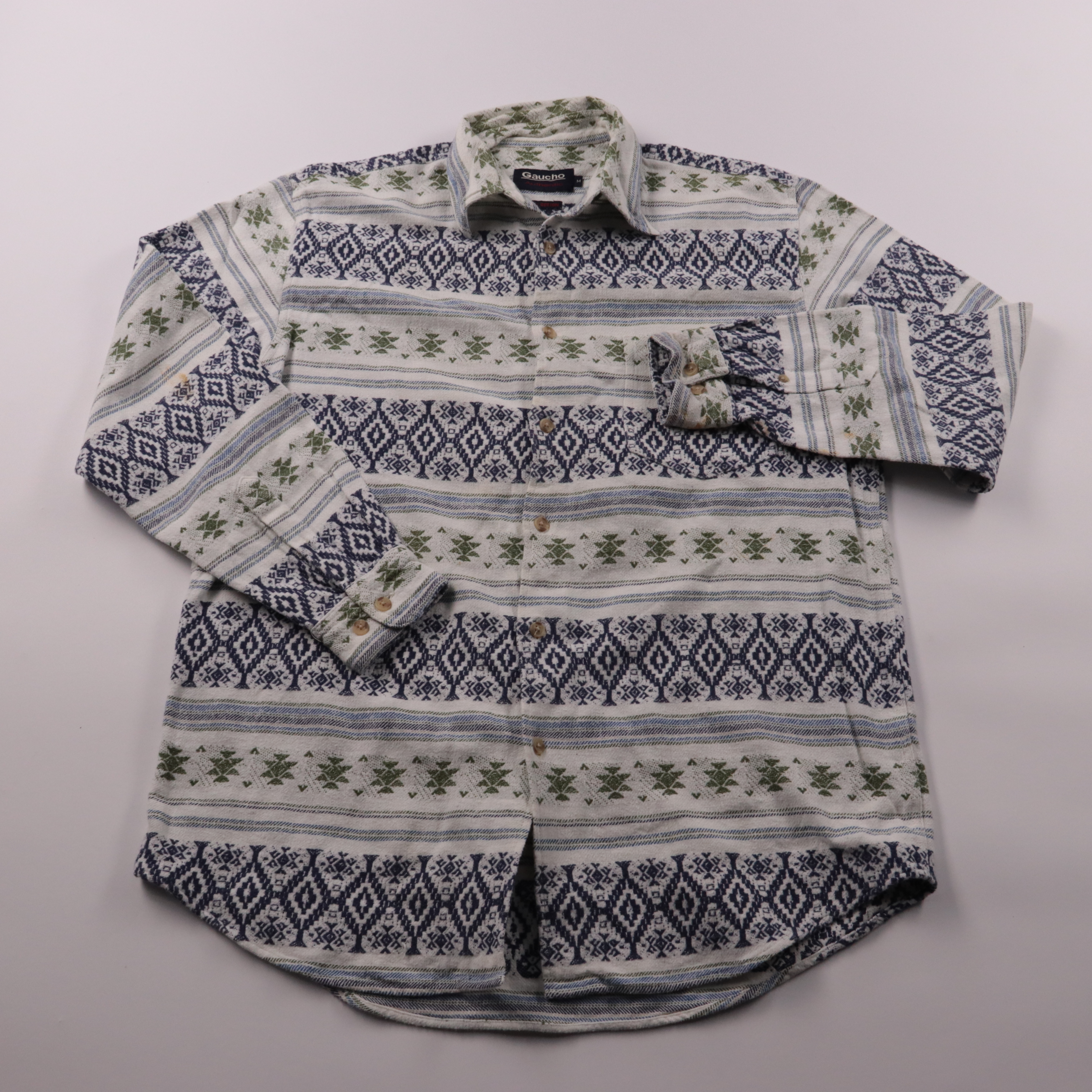 Мужская рубашка Gaucho с длинным рукавом и этническим орнаментом в сине-зелёной гамме. Подойдёт для повседневных образов и прогулок, хорошо смотрится как в застёгнутом виде, так и поверх футболки. Натуральный хлопок приятен к телу и легко стирается.