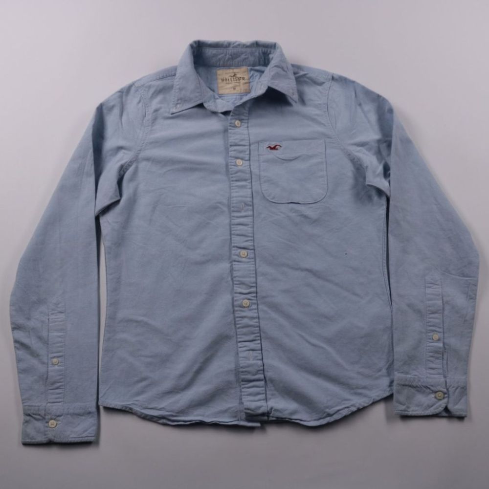 Мужская рубашка Hollister светло-голубого цвета, классический воротник и нагрудный карман с логотипом. Подойдёт для повседневной носки и офиса, хорошо смотрится как самостоятельно, так и поверх футболки. Натуральный хлопок дышит и комфортен в течение дня.