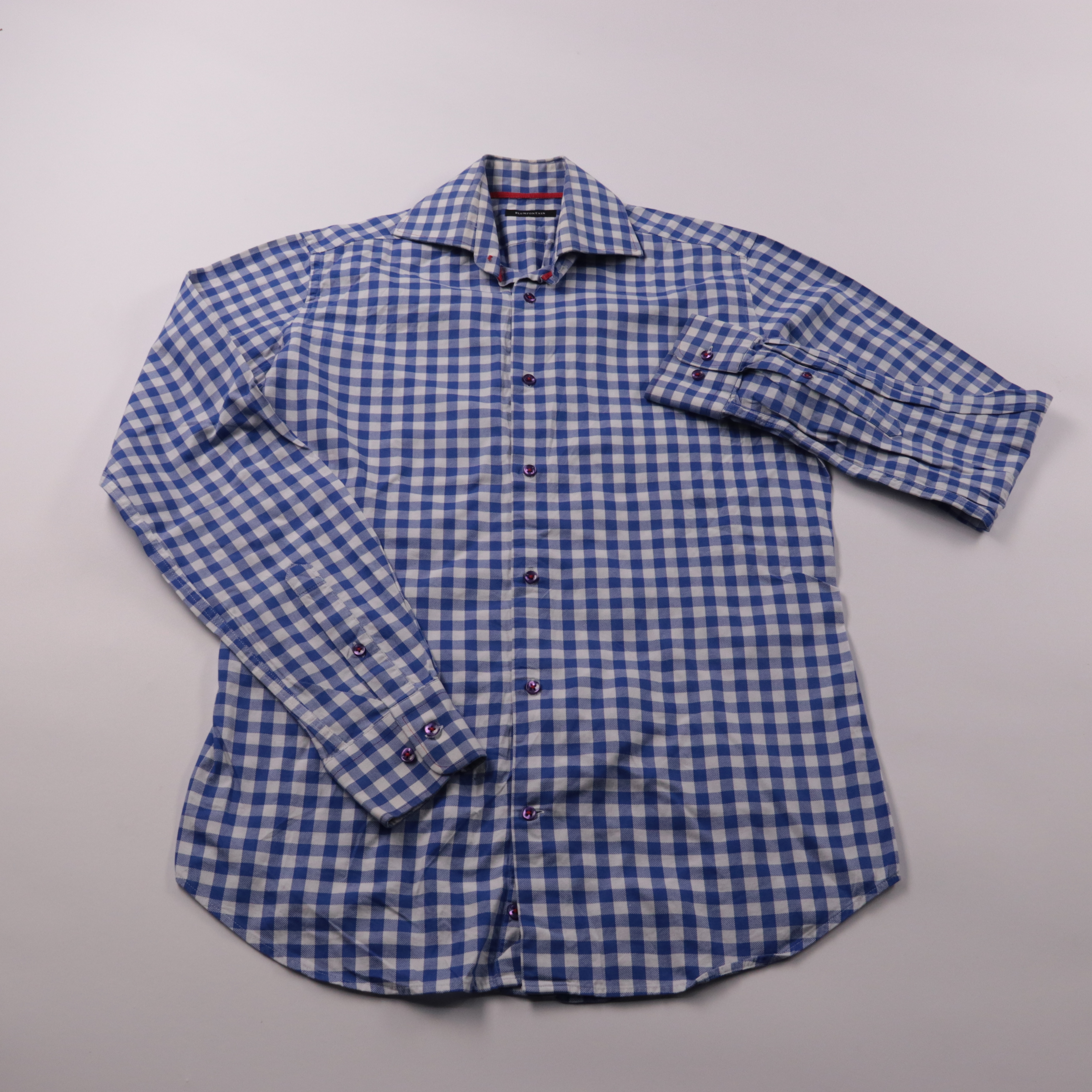 Мужская рубашка Blumfontain в сине-белую клетку, 100% хлопок. Подойдёт для офиса и повседневных образов с джинсами или брюками. Натуральная ткань хорошо дышит и комфортна в носке.