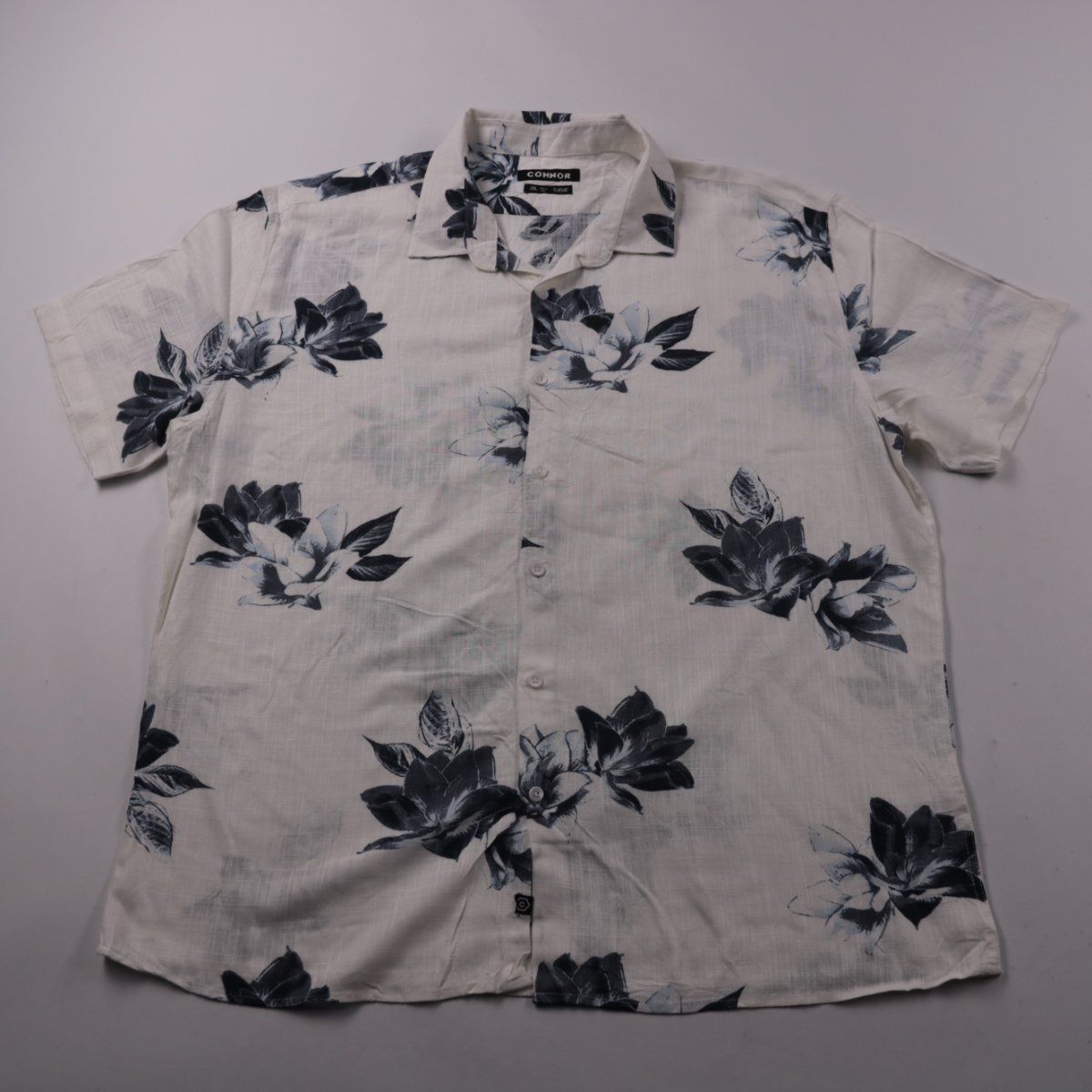 Мужская рубашка Connor Classic с коротким рукавом и цветочным принтом на светлой основе. Подойдёт для лета, отдыха и повседневных образов. Лёгкая ткань с добавлением льна хорошо дышит и комфортна в жару.