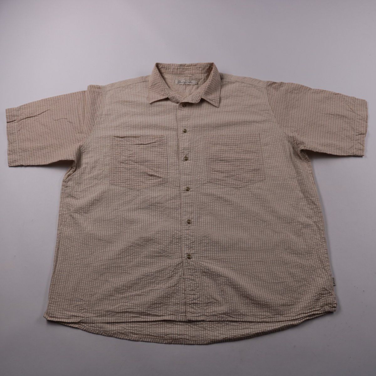 Мужская рубашка Barney Cools с коротким рукавом, на пуговицах, с нагрудными карманами и мелким клетчатым принтом в бежево-коричневых тонах. Подойдёт для повседневных летних образов и поездок, хорошо смотрится с джинсами или шортами. Натуральный хлопок (100%) дышит и комфортен в тёплую погоду.