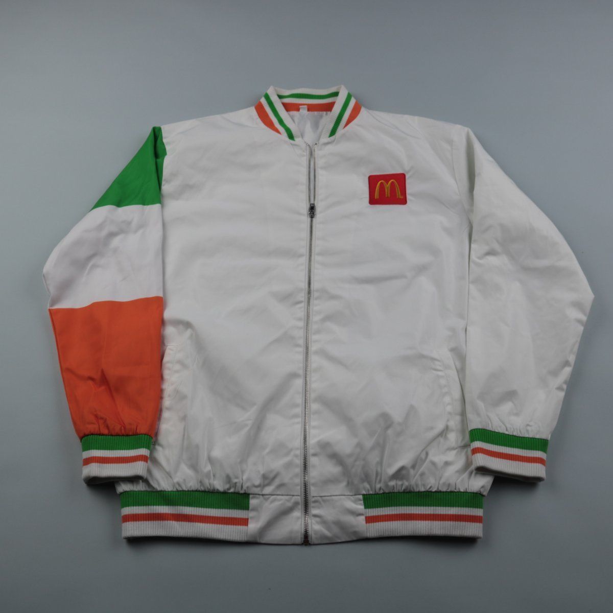 Мужской бомбер на молнии из полиэстера, белый с зелёно-оранжевой отделкой и нашивкой на груди. Подойдёт для повседневной носки в тёплую весну/осень и прохладное лето. Лёгкий материал быстро сохнет и не требует сложного ухода.