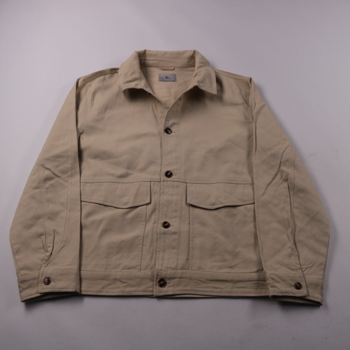 Лёгкая мужская куртка Tu из плотного хлопка, бежевого цвета, с отложным воротником и застёжкой на пуговицы. Подойдёт для повседневной носки весной и осенью, удобно комбинируется с джинсами и брюками. Спереди есть накладные карманы с клапанами — практично для мелочей.