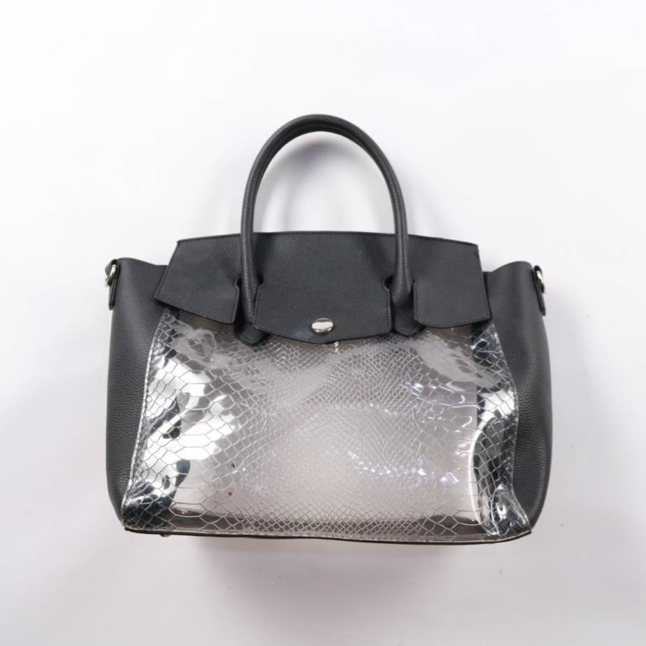 Женская сумка с короткими ручками в чёрном цвете с прозрачной вставкой под рептилию спереди. Подойдёт для города и повседневных выходов, когда нужно взять самое необходимое и держать вещи под рукой. Жёсткое дно на ножках помогает сумке устойчиво стоять...