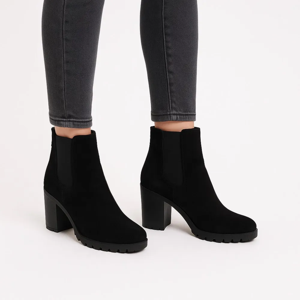 Женские черные ботильоны без указания бренда, на устойчивом каблуке и тракторной подошве. Подойдут для повседневной носки в демисезон и для образов с джинсами или платьями. Удобно надевать за счет боковой молнии, а рельефная подошва дает лучшее сцепление.