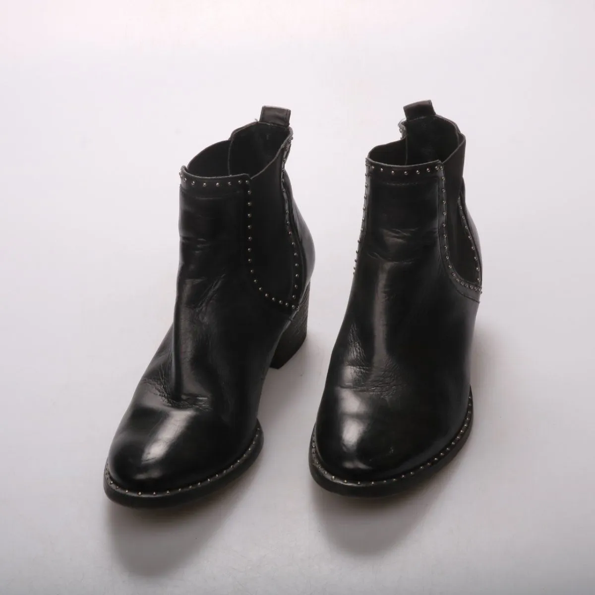 Женские ботильоны Paul Green из чёрной натуральной кожи с декоративными заклёпками по краю и устойчивым каблуком. Подойдут для повседневных образов в межсезонье и офиса. Практичный плюс — удобная посадка за счёт эластичных боковых вставок и невысокого каблука.