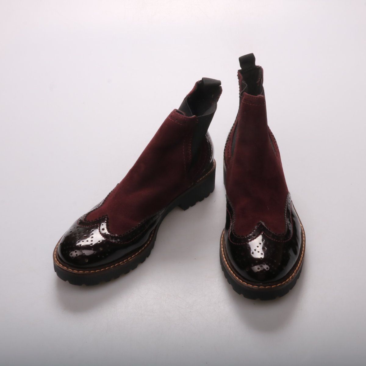 Женские ботильоны Graceland в стиле челси: бордовый верх под замшу с чёрными лакированными вставками и эластичными боковинами. Подойдут для повседневной носки в межсезонье и сочетаются с джинсами и платьями. Рельефная подошва даёт лучшее сцепление на мокром асфальте.
