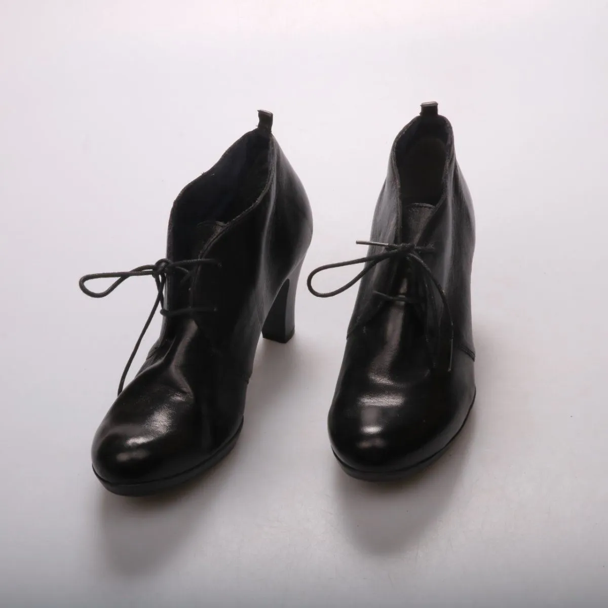 Женские ботильоны Venturini из чёрной гладкой кожи на устойчивом каблуке, со шнуровкой. Подойдут для повседневных и офисных образов в межсезонье. Практичное преимущество — удобная посадка по ноге за счёт регулировки шнурками.