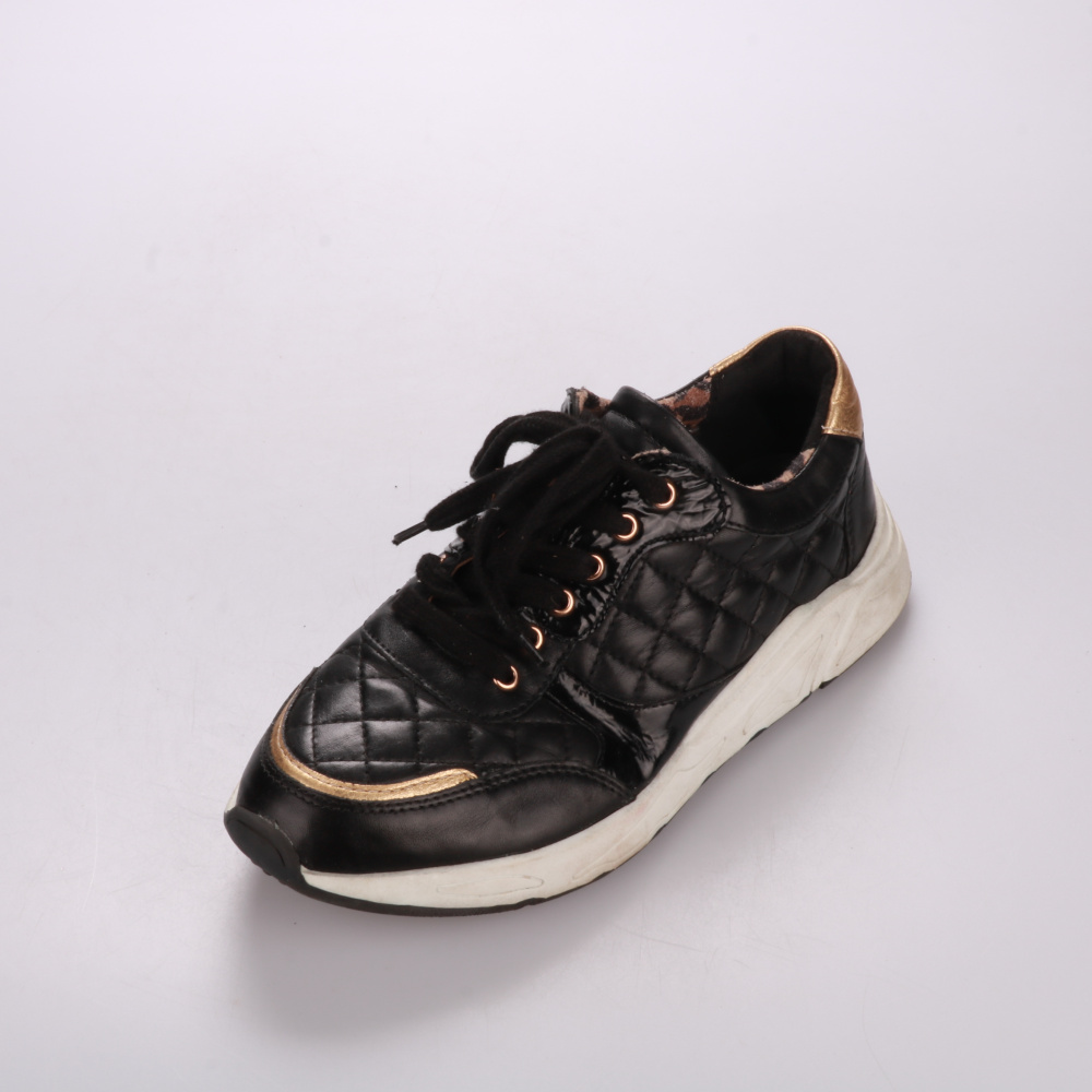 Кроссовки Another A из стёганой чёрной кожи с золотистыми акцентами и шнуровкой. Подойдут для повседневных городских образов в демисезон и прохладное лето. Мягкая массивная подошва амортизирует шаг и делает ходьбу комфортнее.