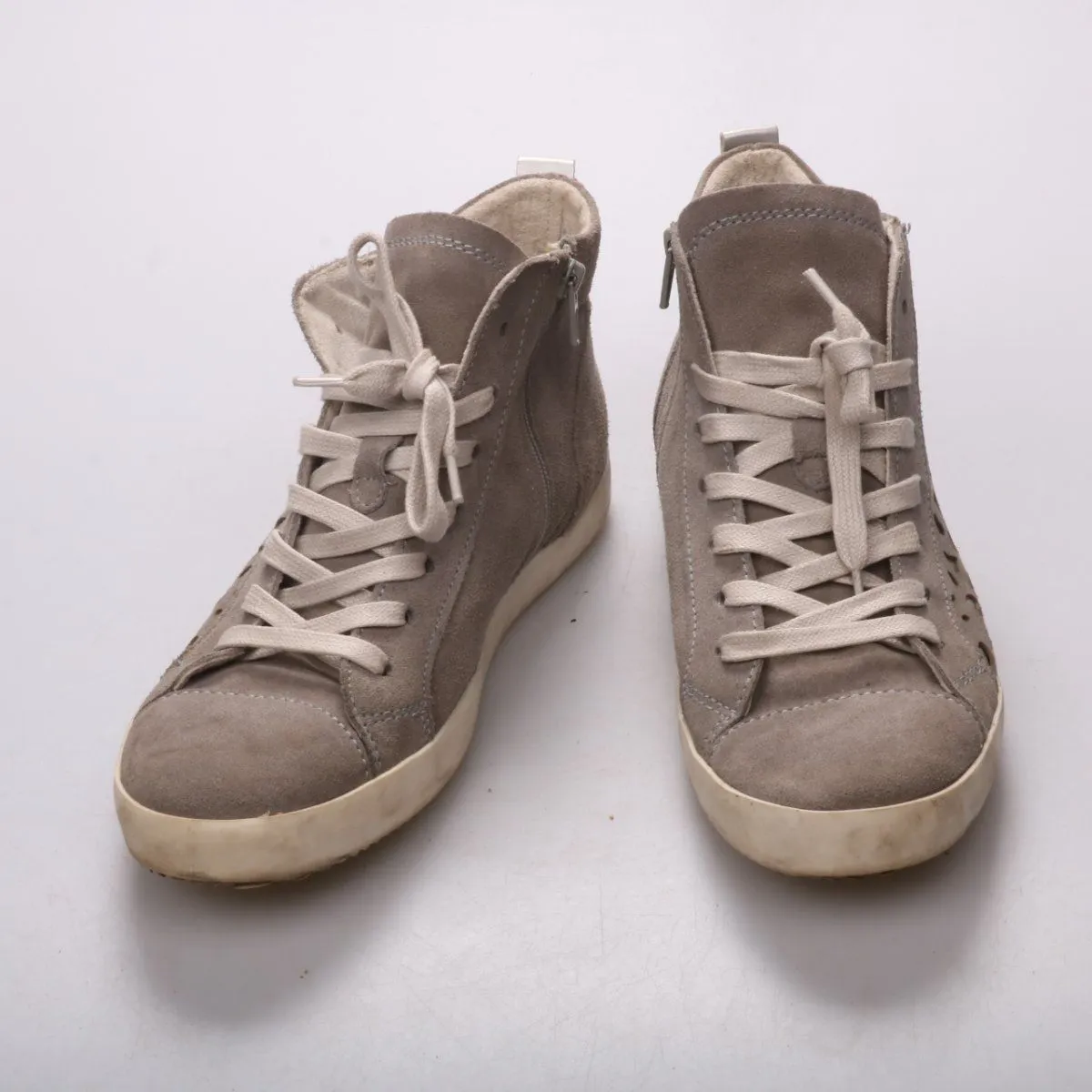 Высокие кеды Tamaris из замши серо-бежевого оттенка, со шнуровкой и боковой молнией для удобной посадки. Подойдут для повседневных прогулок и городских образов в демисезон. Практичное преимущество — молния ускоряет надевание, а резиновая подошва даёт устойчивость.