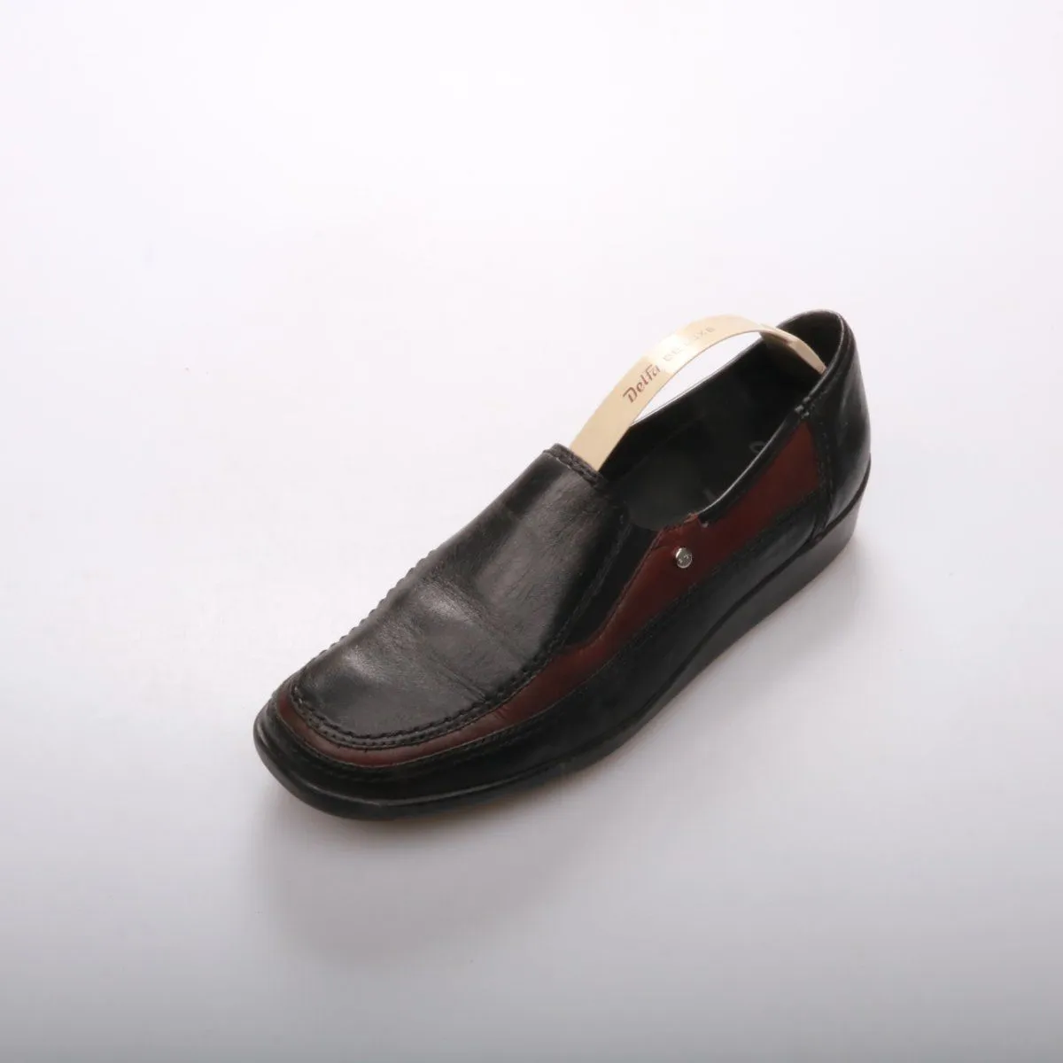 Мужские лоферы Arc из гладкой кожи в чёрно-бордовом цвете, без шнуровки. Подойдут для офиса и повседневных образов с брюками или джинсами. Практичная подошва с протектором даёт устойчивость и комфорт при ходьбе.