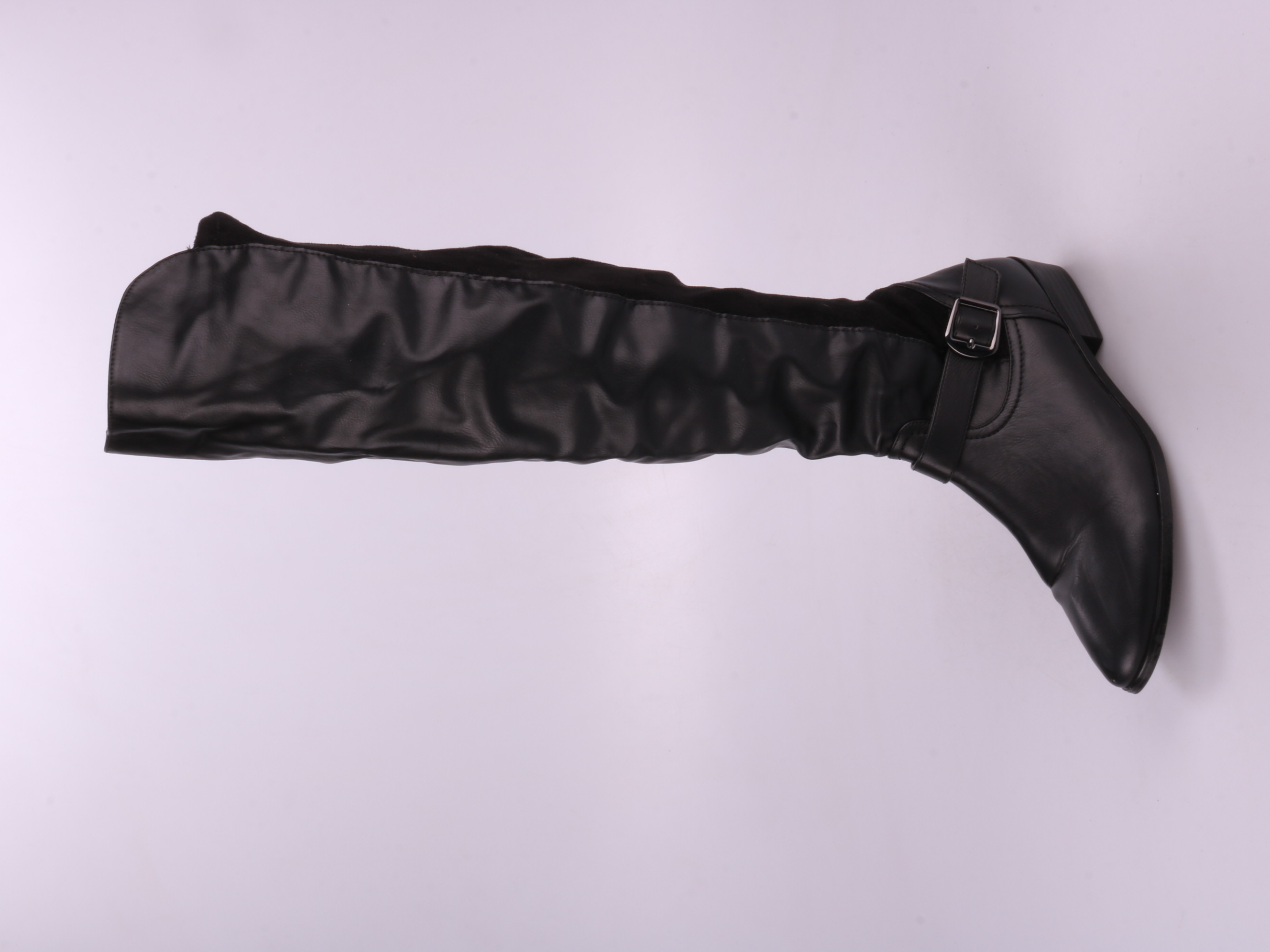 Высокие чёрные сапоги с ремешком и пряжкой, на низком устойчивом каблуке. Подойдут для повседневной носки осенью и весной, хорошо смотрятся с платьями и узкими джинсами. Удобная посадка и молния сбоку позволяют быстро надевать и снимать.