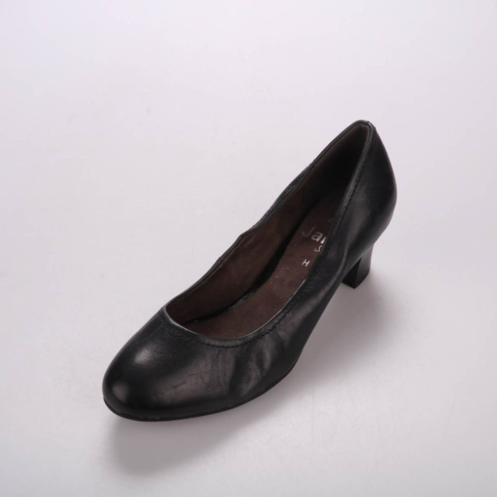 Женские туфли Jana из гладкой чёрной кожи на устойчивом каблуке средней высоты. Подойдут для офиса и повседневных образов, хорошо сочетаются с платьями и брюками. Удобная колодка и широкий каблук делают их практичными для длительной носки.
