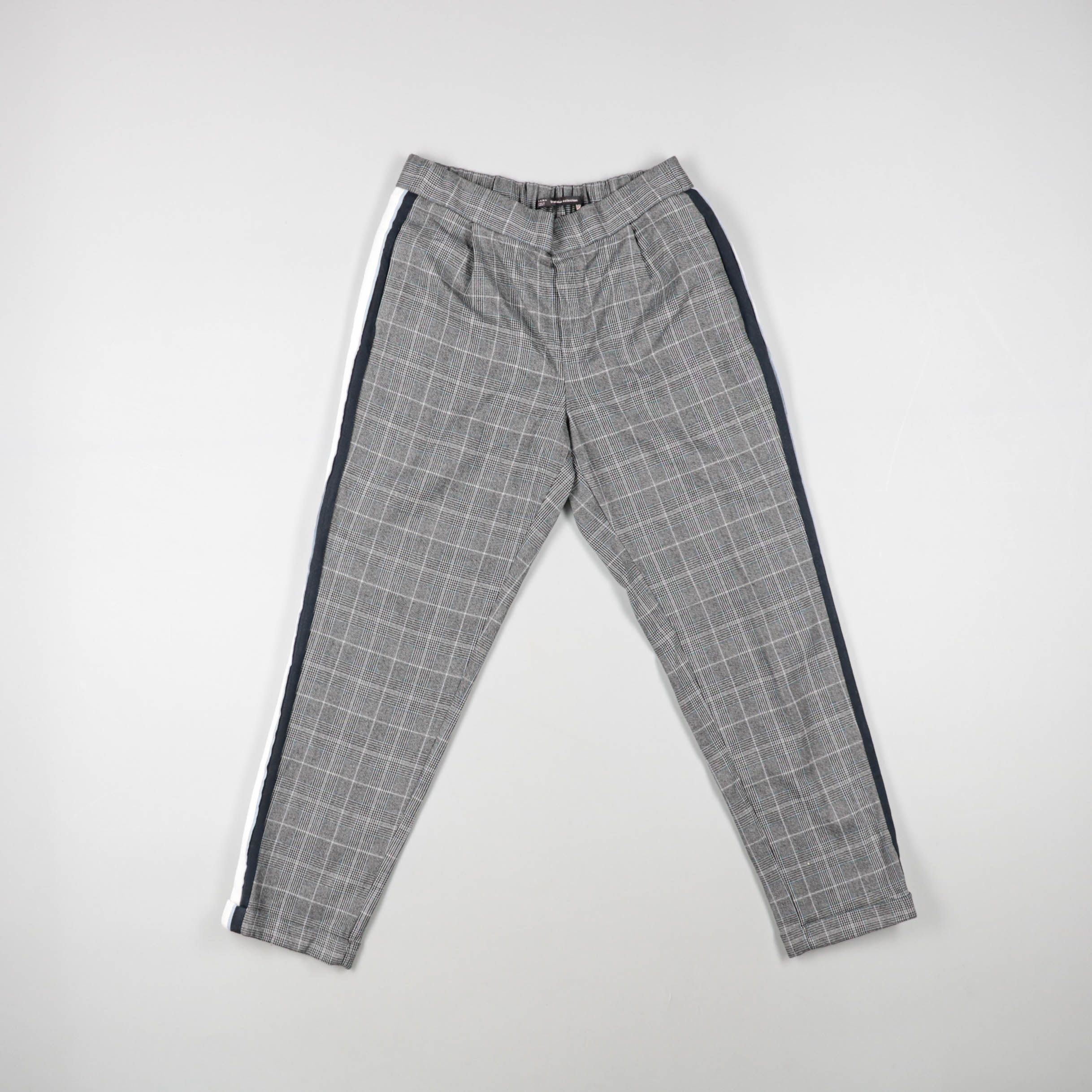 Женские брюки в серую клетку с контрастными лампасами по бокам. Подойдут для повседневных и офисных образов с футболкой, рубашкой или жакетом. Эластичный пояс сзади обеспечивает более комфортную посадку и удобство в носке.
