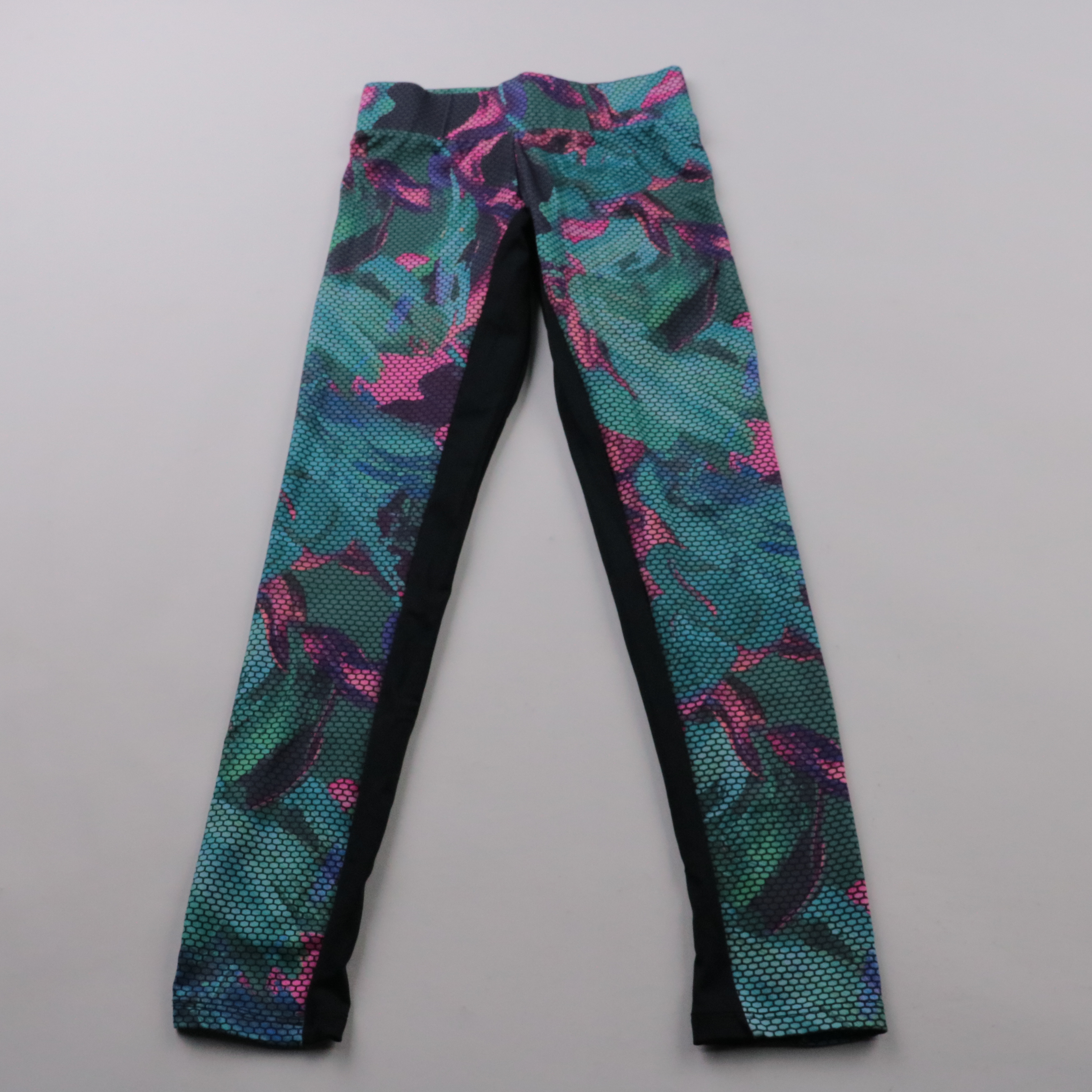 Спортивные легинсы F&F Active с ярким зелёно-розово-фиолетовым принтом и чёрными вставками по внутренней стороне. Подойдут для тренировок, йоги и активных прогулок. Эластичный материал хорошо тянется и не сковывает движения.