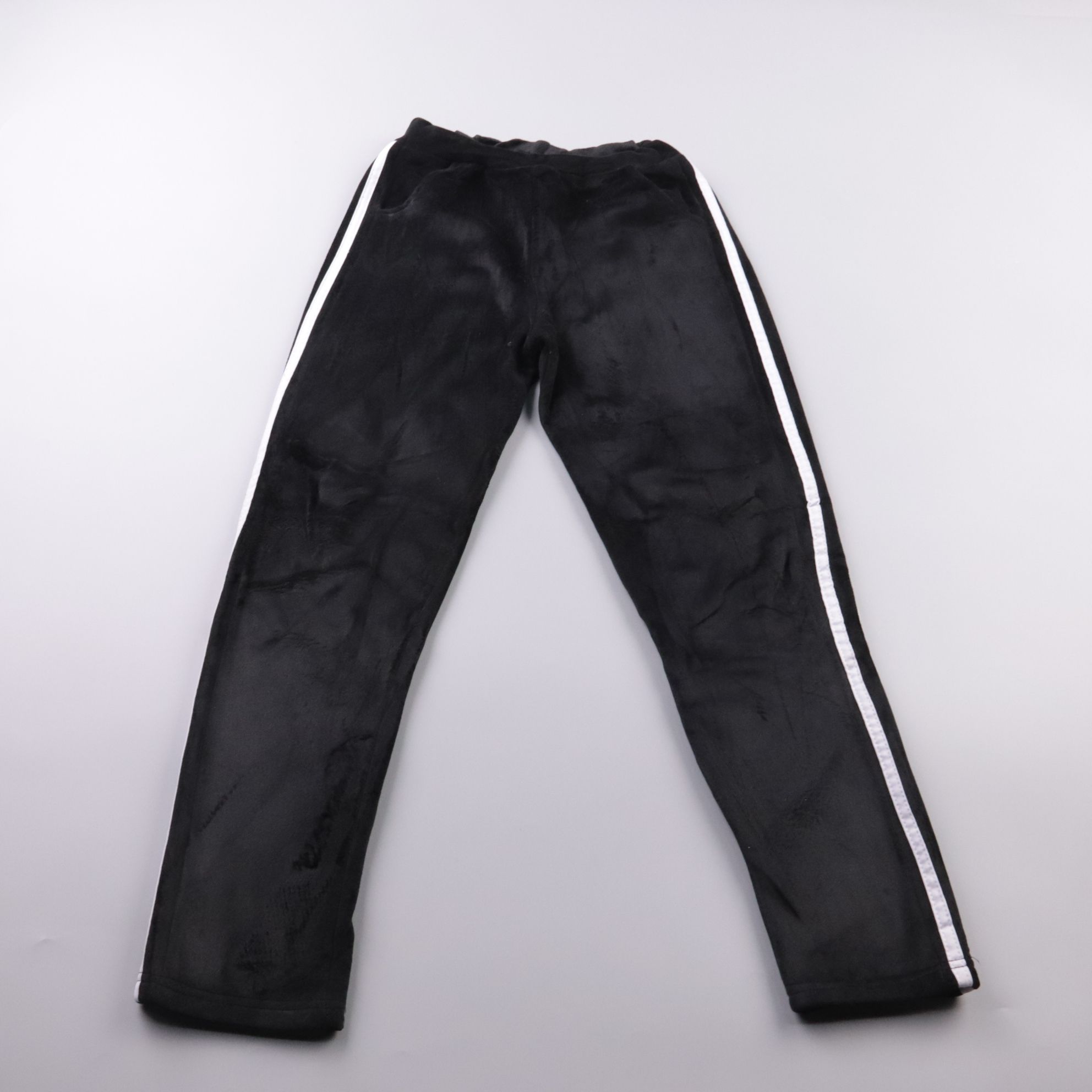 Чёрные утеплённые брюки с белыми лампасами по бокам и эластичным поясом. Подойдут для прогулок и повседневной носки в холодное время года. Практичное преимущество — тянущаяся ткань и тёплая внутренняя сторона.