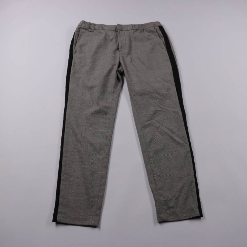 Женские брюки H&M в сером цвете с тонкой клеткой и контрастными чёрными лампасами по бокам. Подойдут для офиса и повседневных образов, хорошо смотрятся с рубашкой, водолазкой или жакетом. Практичный плюс — эластичная ткань и удобная посадка с карманами.