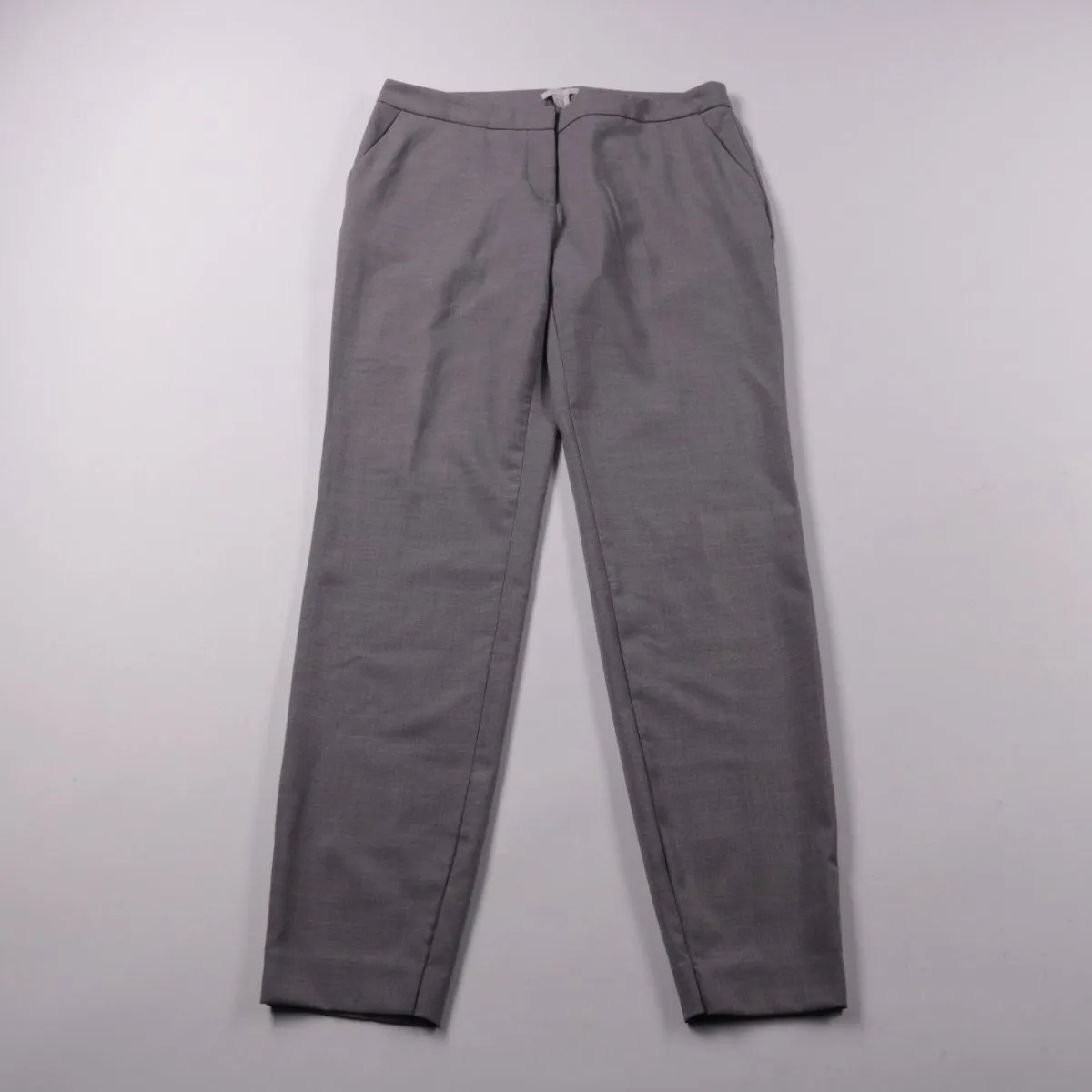 Женские брюки H&M серого цвета, прямого кроя со стрелками и боковыми карманами. Подойдут для офиса и повседневных образов в демисезон и круглый год. Ткань с эластаном чуть тянется и комфортно сидит на талии.