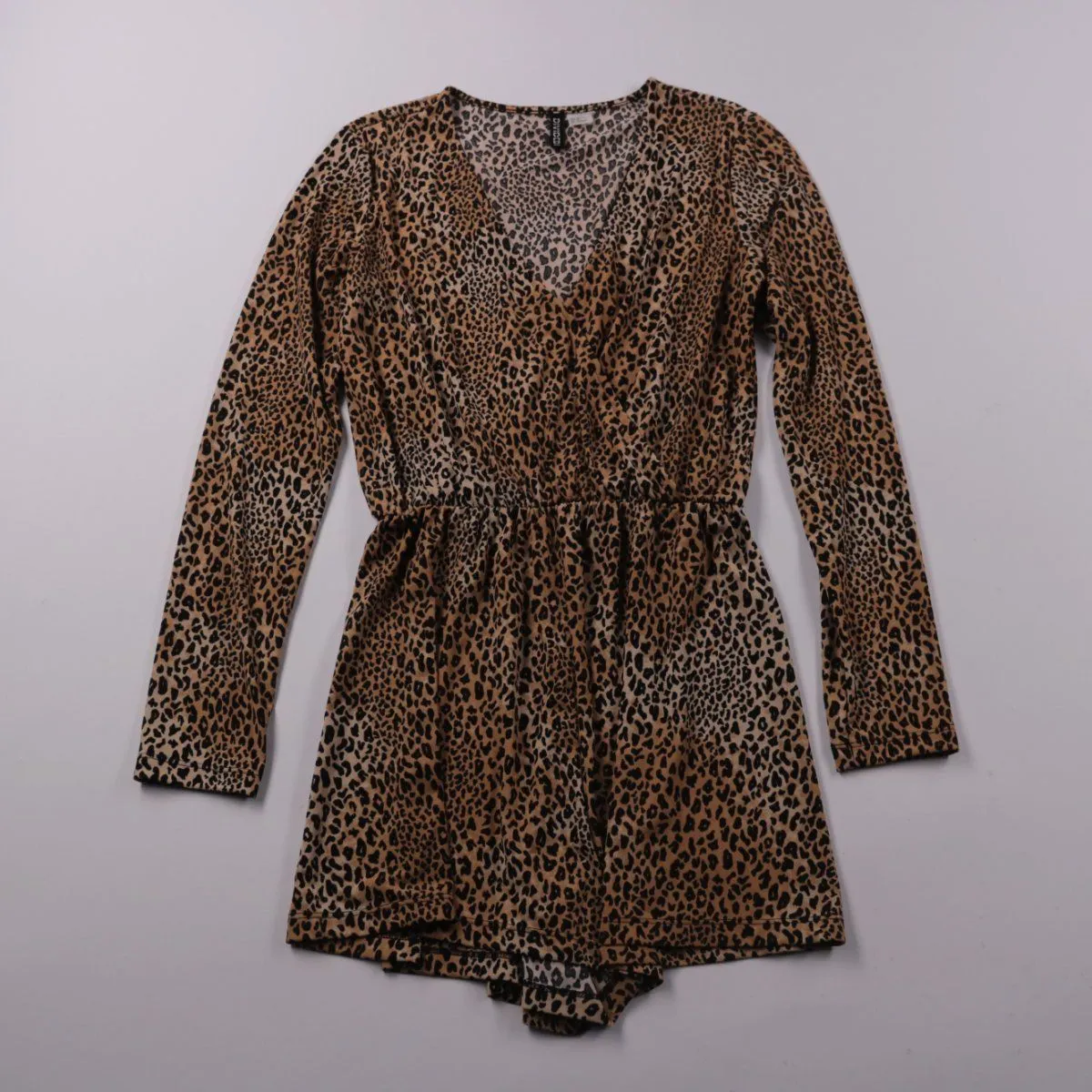 Женский комбинезон H&M с леопардовым принтом, длинным рукавом и V-образным вырезом. Подойдёт для повседневных образов и летних выходов, талию подчёркивает эластичная сборка. Лёгкий тянущийся материал комфортно садится и не сковывает движения.