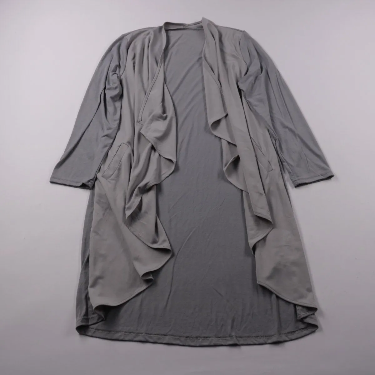 Женский кардиган-накидка серого цвета с драпированными полочками и карманами. Подойдёт для повседневных образов и офиса, удобно носить поверх платья или топа в прохладную погоду. Ткань тянется и не мнётся так сильно, как натуральные материалы.
