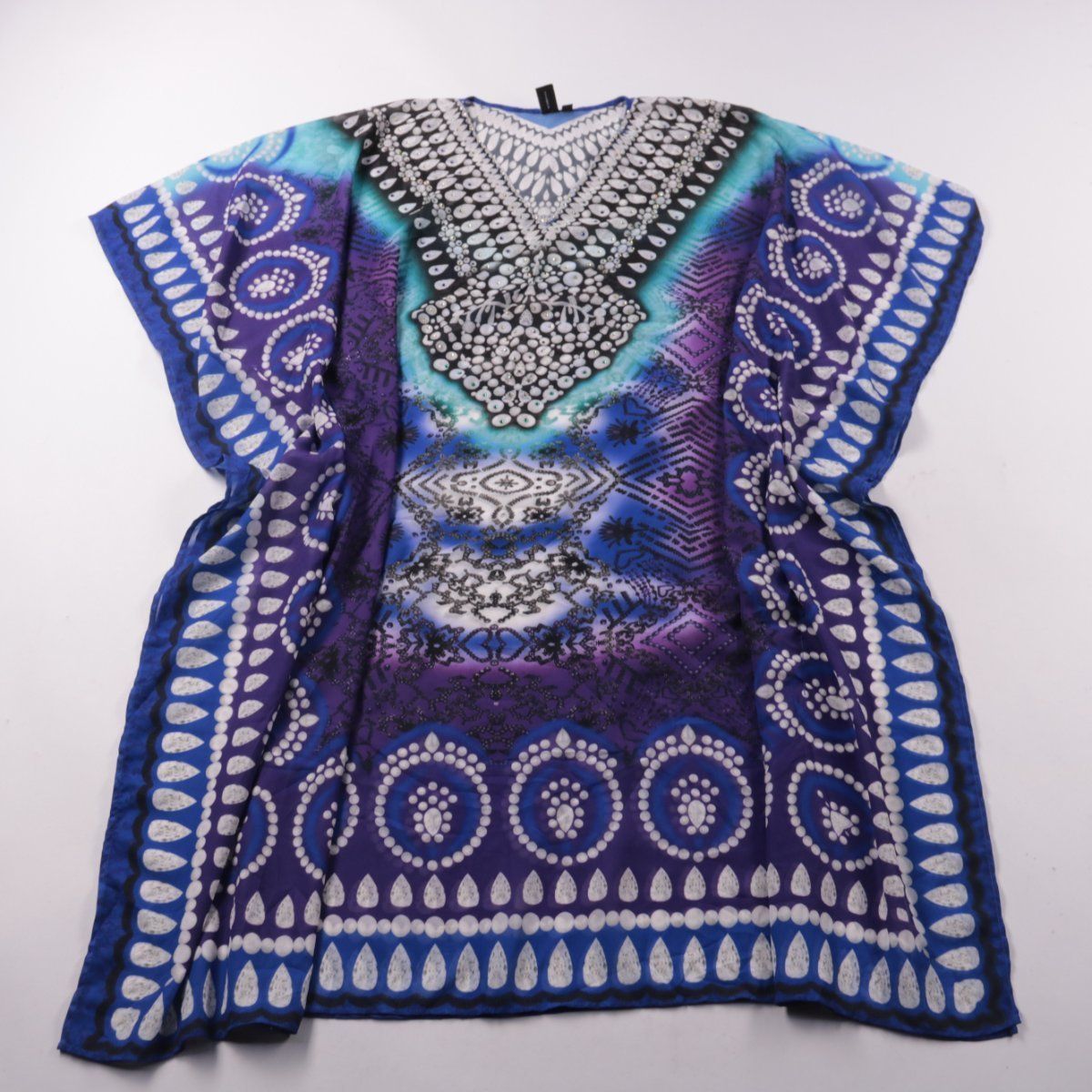 Женская туника IZABEL LONDON свободного кроя с V-образным вырезом и ярким орнаментальным принтом в сине-фиолетовых тонах. Подойдёт для пляжа, отпуска или как лёгкая накидка в жаркую погоду. Полиэстер быстро сохнет и простой в уходе.