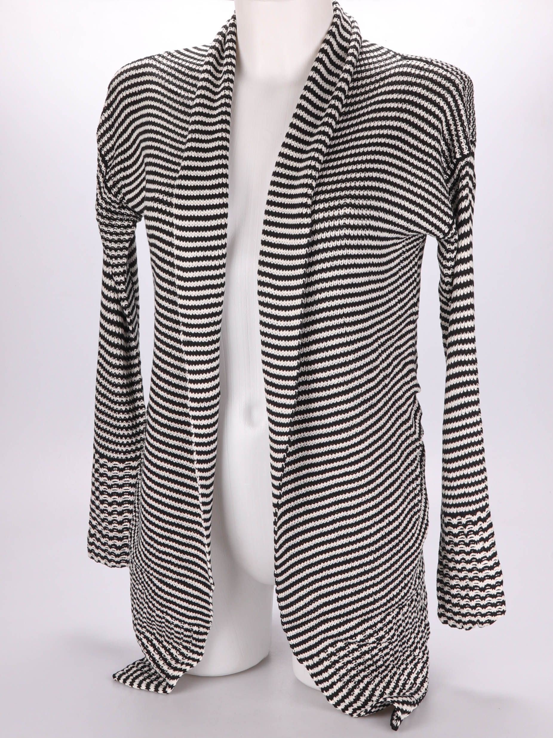 Женский кардиган в чёрно-белую полоску с открытым передом и мягко драпирующимися полочками. Подойдёт для повседневных образов и офиса, легко сочетается с базовыми топами и джинсами. Удобен для многослойности и не стесняет движения.