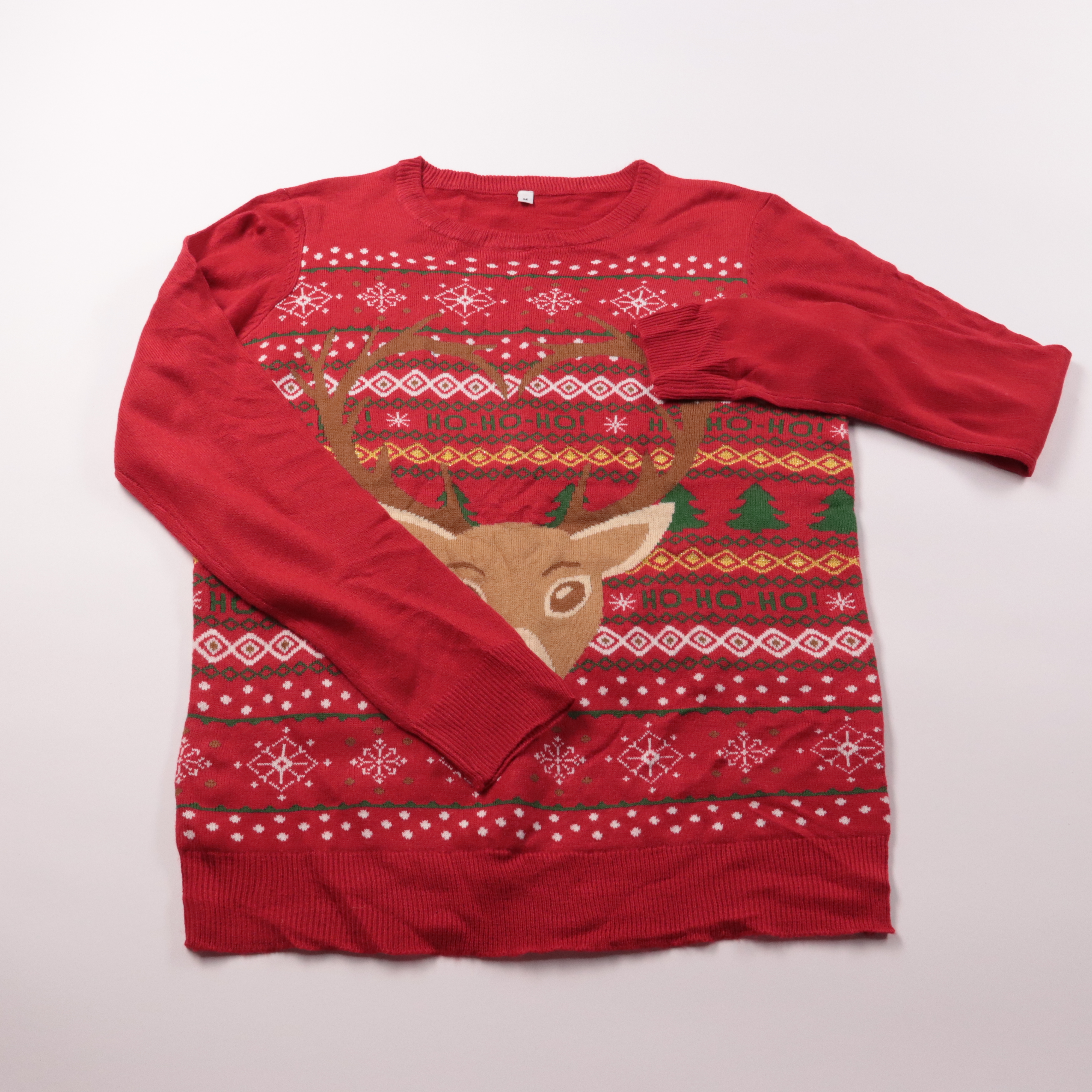 Вязаный новогодний свитер с рисунком оленя и орнаментом «ho-ho-ho», размер M. Подойдёт для зимних прогулок, праздников и тематических вечеринок. Практичный плюс — акриловый материал прост в уходе и быстро сохнет после стирки.