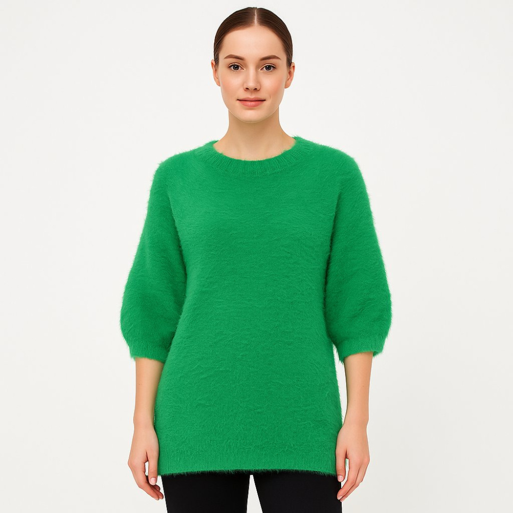 Женский пушистый джемпер Gallery ярко‑зелёного цвета с круглым вырезом и рукавами 3/4. Подойдёт для повседневных образов в прохладную погоду, хорошо смотрится с джинсами или брюками. Практичен в уходе: материал 100% полиамид, быстро сохнет и держит форму.