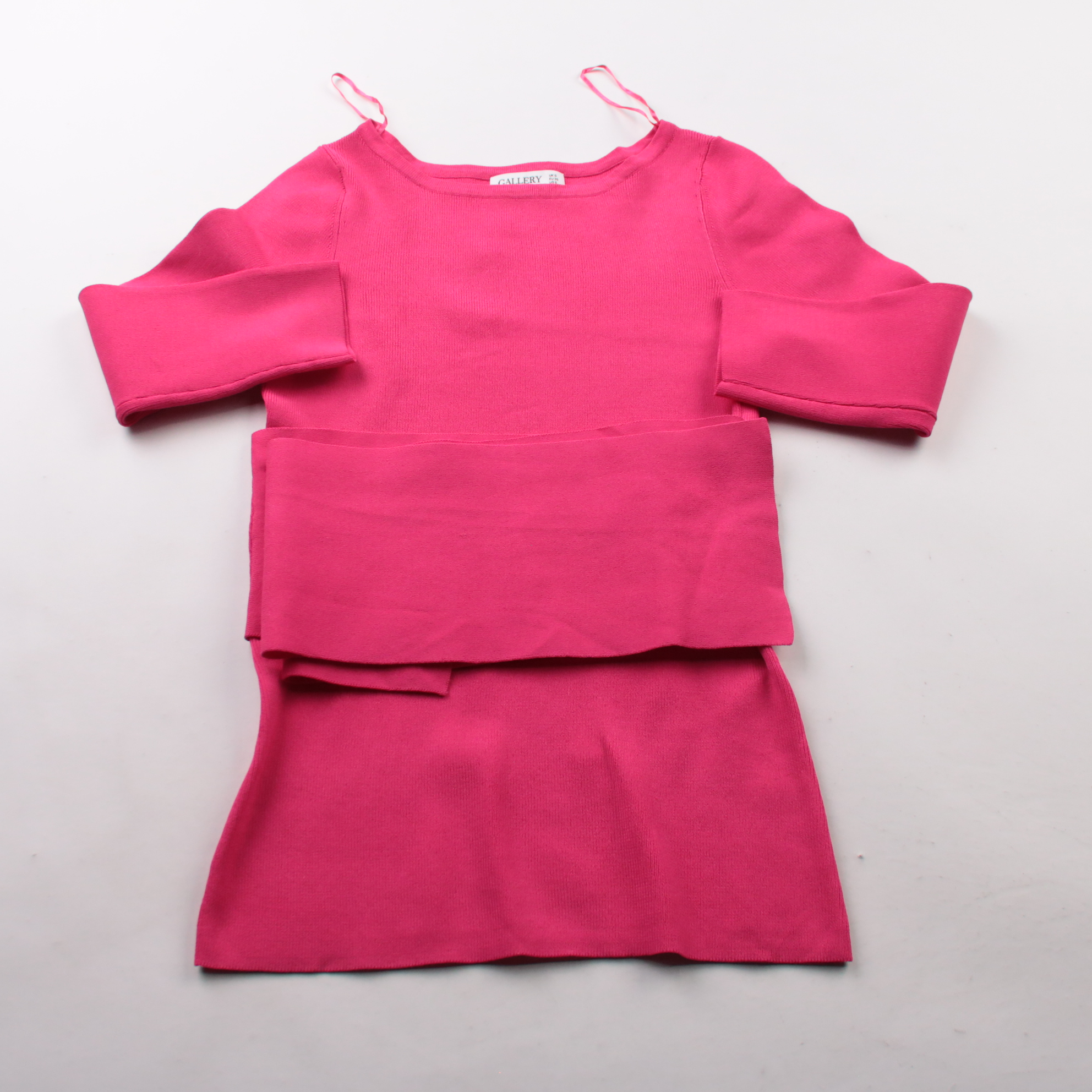 Трикотажное платье Gallery яркого розового цвета с открытыми плечами и длинными рукавами. Подойдёт для вечеринок и вечерних выходов, хорошо смотрится с каблуками или грубыми ботинками. Эластичный материал комфортно садится по фигуре и почти не мнётся.