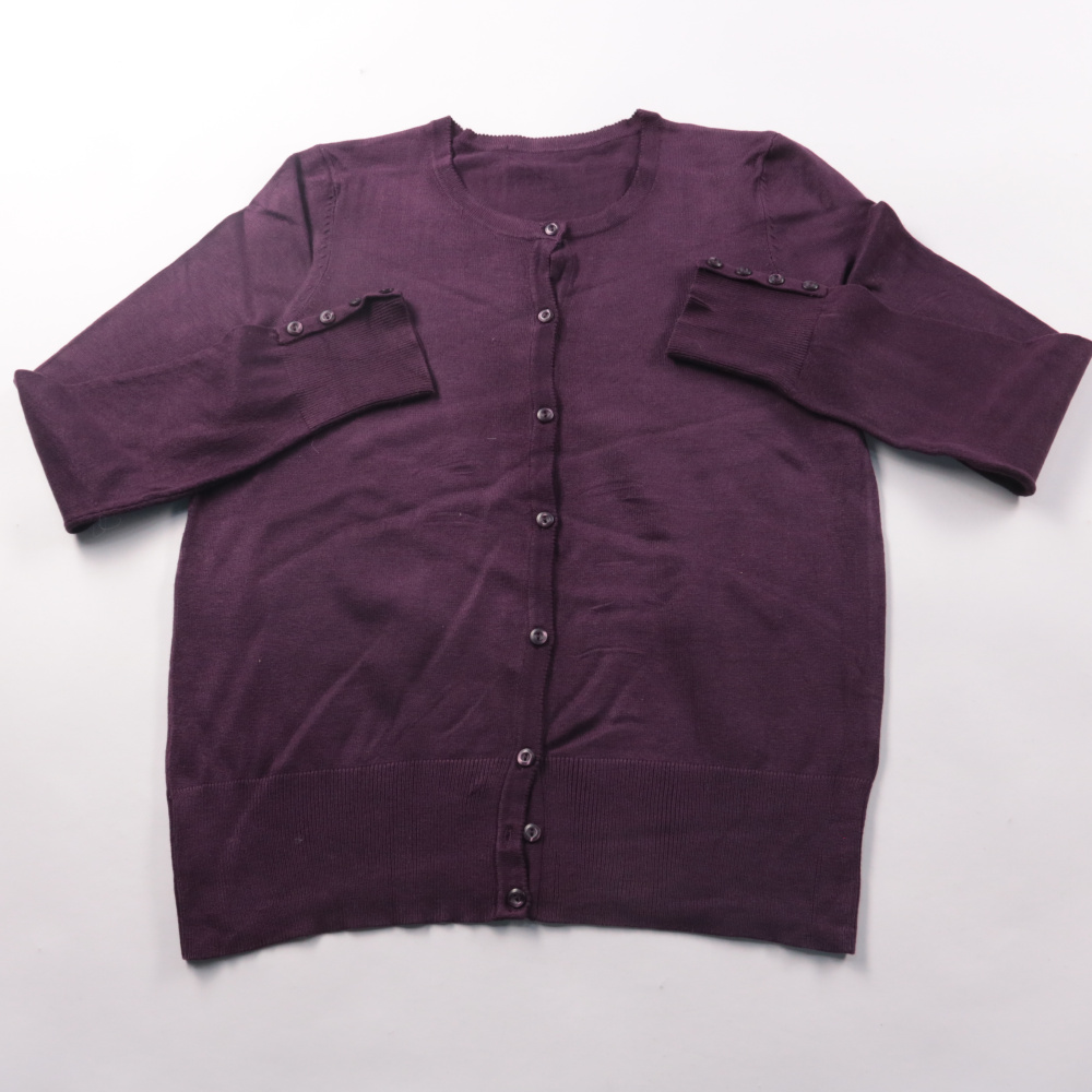 Женский кардиган на пуговицах, без выраженного бренда, в глубоким фиолетовом оттенке. Подойдёт для офиса и повседневных образов в демисезон, удобно носить как самостоятельный верх или слоем поверх топа. Практичный плюс — легко застёгивается и сочетаетс...