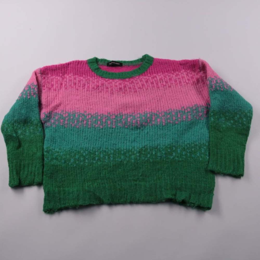 Вязаный свитер Svssyclassy в розово-зелёной гамме с фактурным узором и круглым вырезом. Подойдёт для прохладных дней и многослойных образов с джинсами или юбкой. Смесовая пряжа с полиамидом делает вещь более износостойкой и легче в уходе.