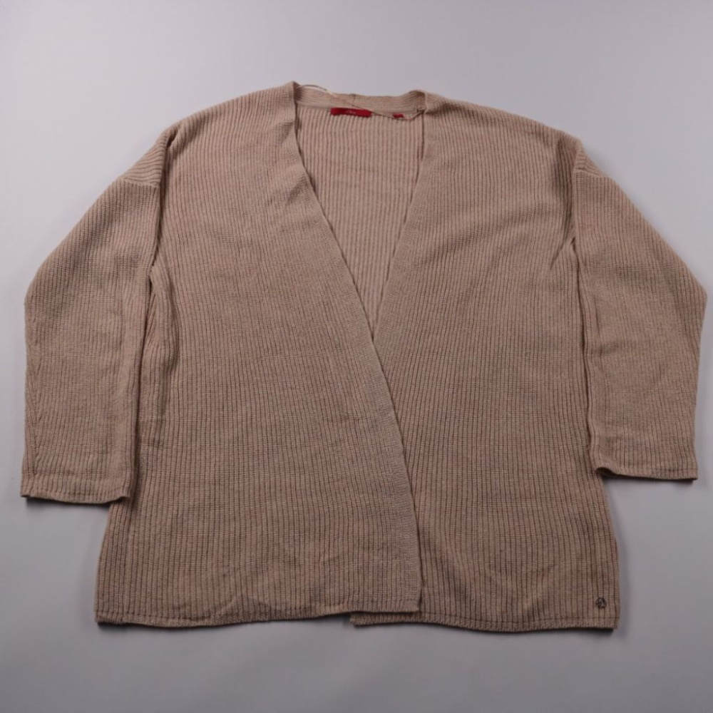 Вязаный кардиган S.Oliver бежевого цвета в рубчик, без застёжки и с V-образным вырезом. Подойдёт для повседневных образов и офиса как лёгкий верхний слой на прохладную погоду. Смесовый состав с хлопком приятен к телу и прост в уходе.