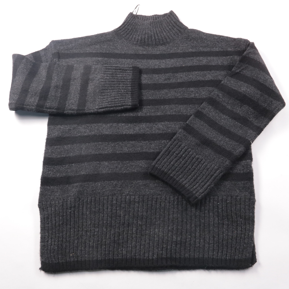 Свитер New Look в серо-чёрную полоску с высоким воротником-стойкой. Подойдёт для повседневной носки в прохладную погоду, удобно комбинируется с джинсами и юбками. Практичный плюс — мягкий трикотаж с эластаном, хорошо тянется и сохраняет форму.