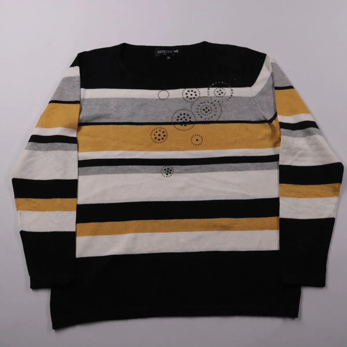 Джемпер Hepburn в широкую полоску (чёрный/белый/серый с горчичным) с квадратным вырезом и декоративными стразами спереди. Подойдёт для повседневных образов в демисезон и прохладные летние вечера, хорошо сочетается с джинсами и однотонными брюками. Тонкий трикотаж приятно носить под жакет, материал меньше мнётся и быстро сохнет.