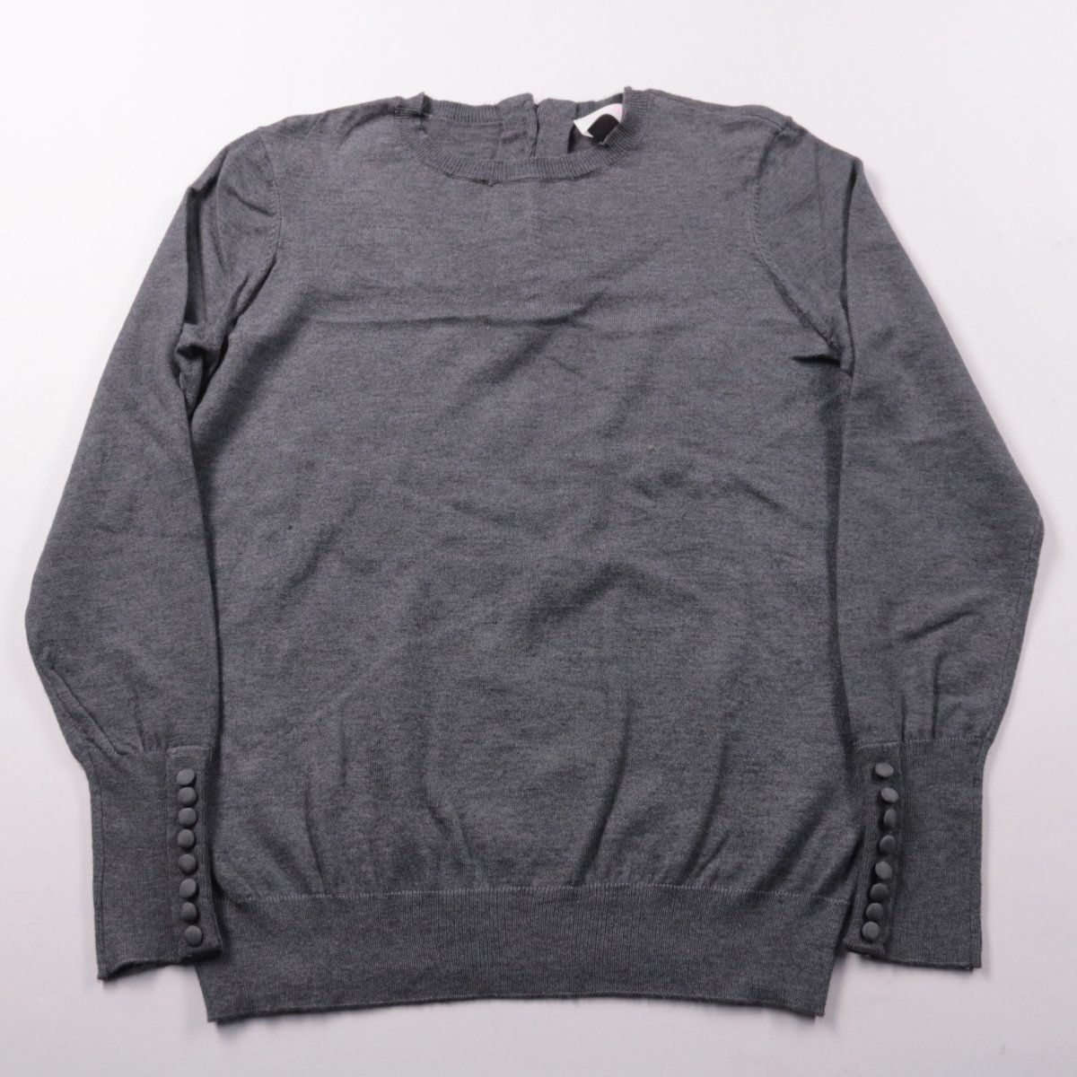 Женский джемпер Stradivarius серого цвета с круглым вырезом и декоративными пуговицами на манжетах. Подойдёт для повседневных образов на работу или учёбу в демисезон. Лёгкий трикотаж из вискозы приятен к телу и удобно сочетается с базовым гардеробом.