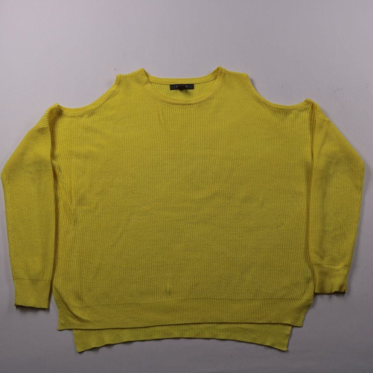 Женский джемпер Primark ярко-жёлтого цвета в рубчик, с вырезами на плечах (cold shoulder). Подойдёт для повседневных образов и встреч, хорошо сочетается с джинсами и юбками. Акриловый трикотаж мягкий и не требует сложного ухода.