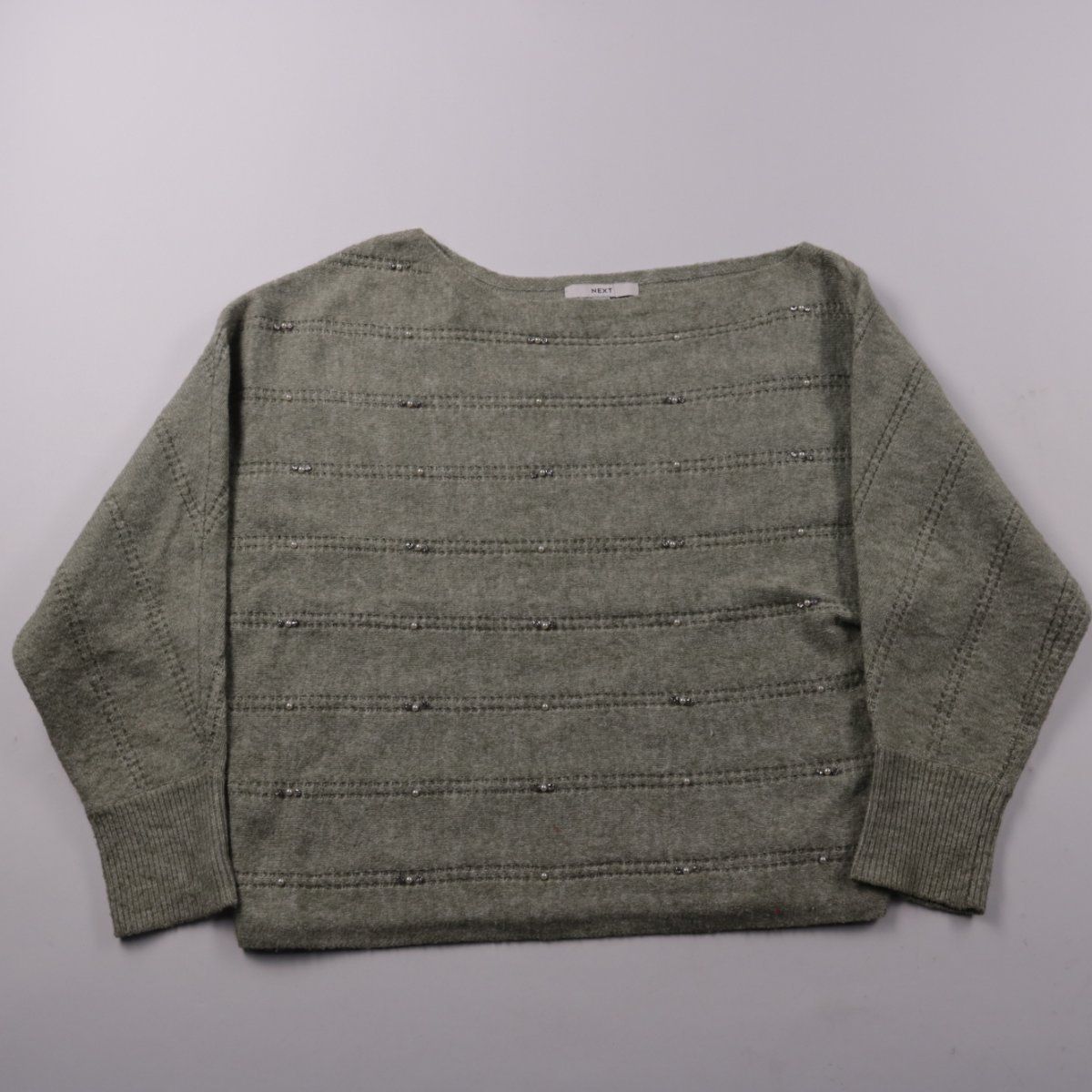 Женский джемпер Next в сером оттенке, с декоративными горизонтальными строчками и лёгким мерцанием. Подойдёт для повседневных образов в офис и на прогулки, хорошо сочетается с джинсами и юбками. Мягкий смесовый состав (шерсть/полиэстер/акрил) делает его тёплым и практичным в уходе.