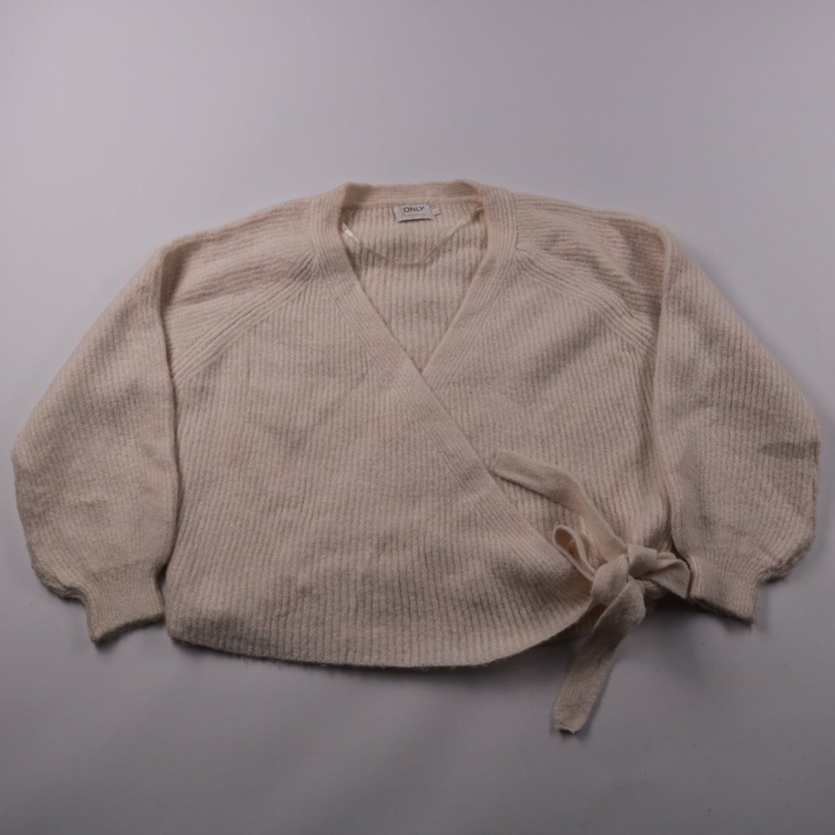 Кардиган ONLY в бежевом цвете, модель на запах с завязками. Подойдёт для повседневных образов и как лёгкий верхний слой в прохладные дни. Мягкий трикотаж удобно садится и не сковывает движения.