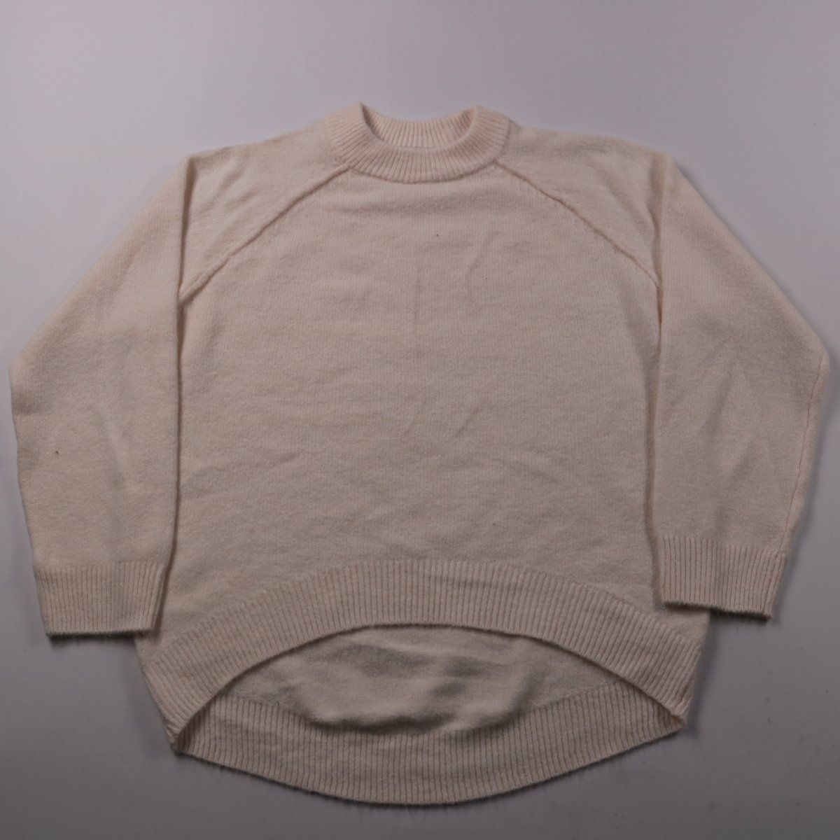 Джемпер George светлого кремово-бежевого оттенка с рукавом реглан и удлинённой спинкой. Подойдёт для прохладной погоды весной, осенью и зимой в помещении. Свободный крой удобен для многослойных образов и не сковывает движения.