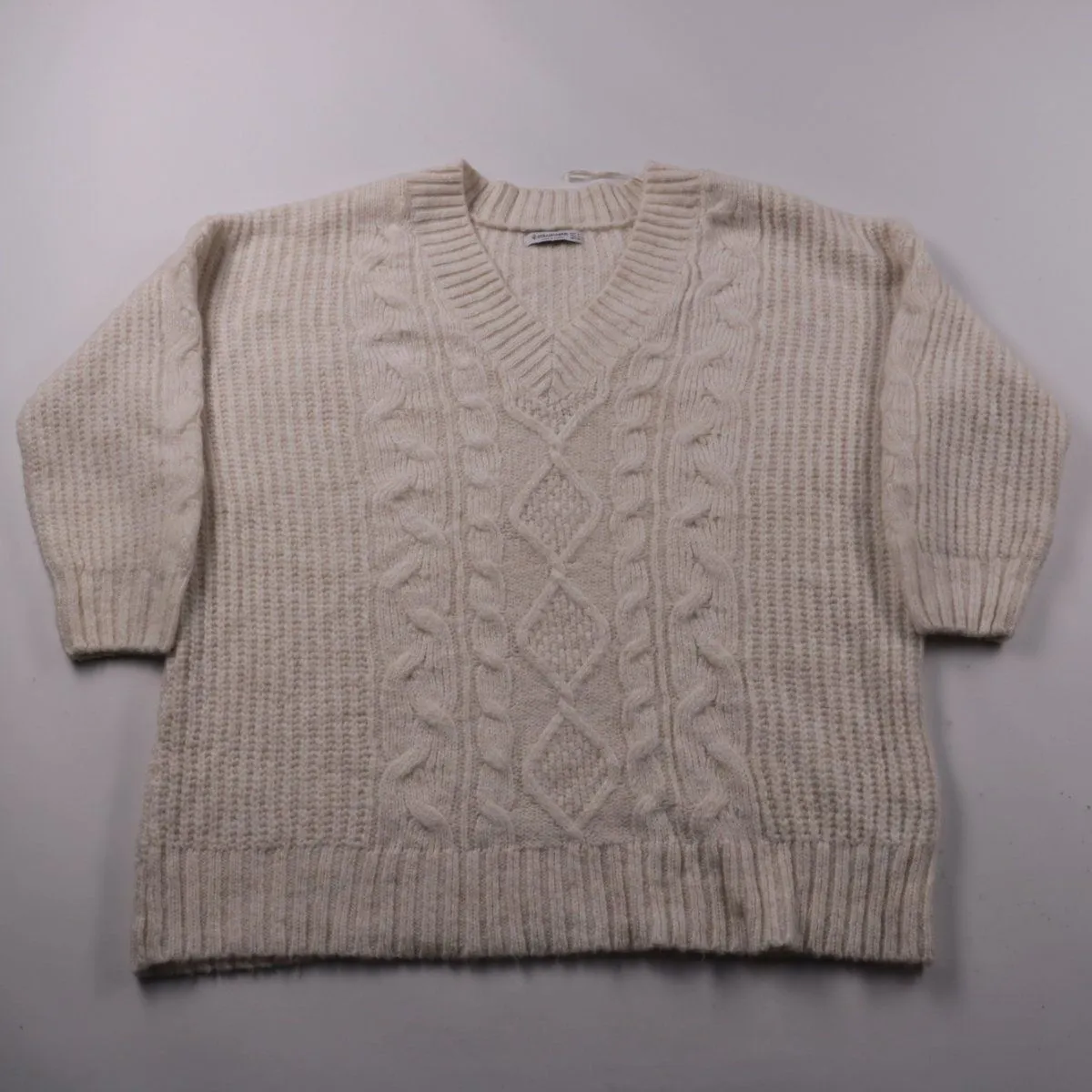 Вязаный джемпер Stradivarius молочно-бежевого цвета с V-образным вырезом и рельефным узором «косы» спереди. Подойдёт для повседневных образов в прохладную погоду, хорошо сочетается с джинсами и юбками. Практичное преимущество — мягкий акриловый трикотаж прост в уходе и держит форму.