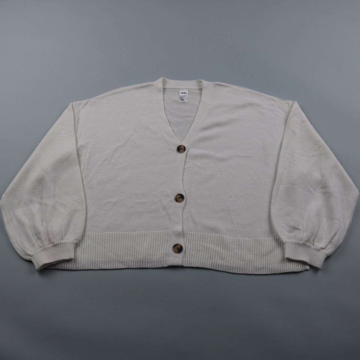 Вязаный кардиган Anko молочного цвета на пуговицах, с V-образным вырезом и манжетами на резинке. Подойдёт для повседневных образов и как второй слой в офис или прохладным вечером. Удобно регулировать посадку за счёт застёжки на пуговицы.