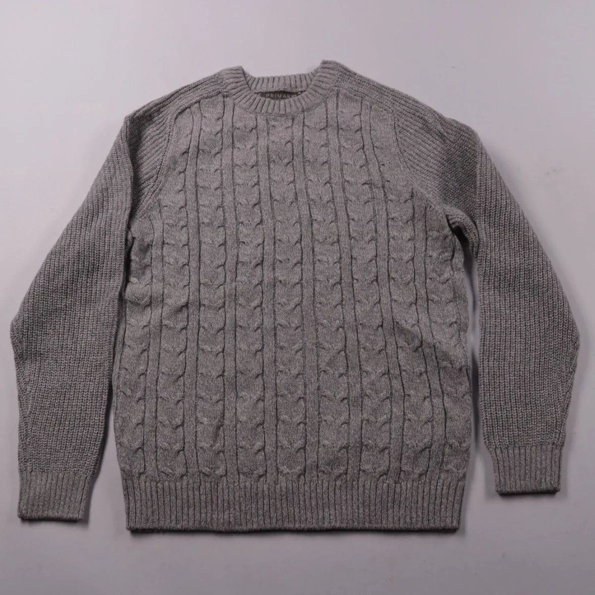 Свитер Primark серого меланжевого цвета с фактурной вязкой «косы» и круглым вырезом. Подойдёт для повседневных образов в прохладную погоду, хорошо смотрится с джинсами и юбками. Смесь хлопка и акрила делает вещь тёплой и простой в уходе.