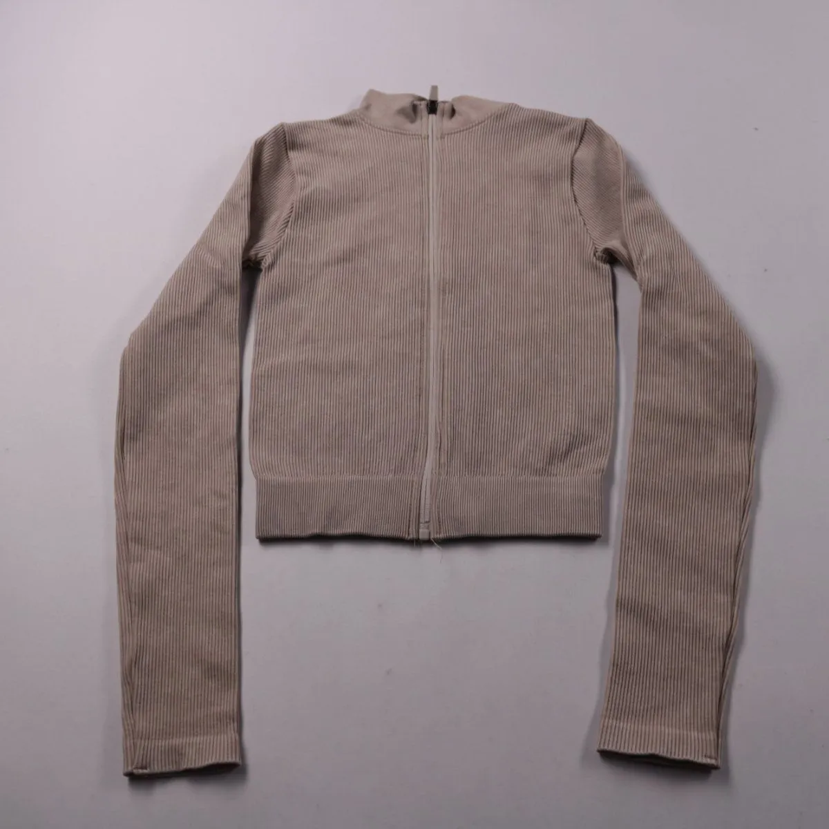 Рифлёная кофта на молнии с высоким воротником-стойкой, бренд не указан. Подойдёт для повседневных образов и как базовый слой в прохладную погоду. Эластичный материал хорошо тянется и плотно садится по фигуре.