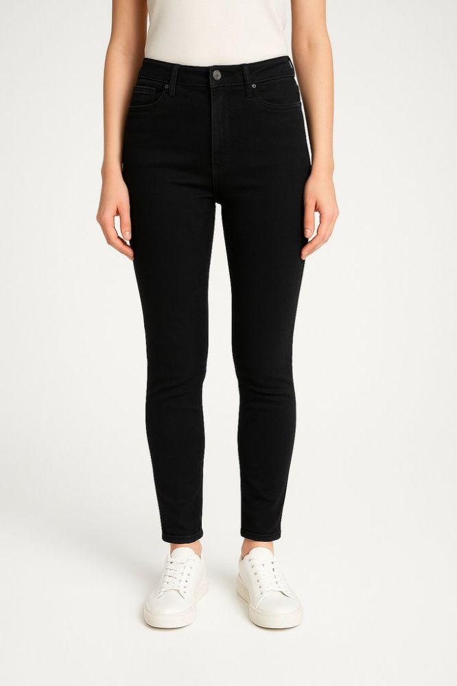 Женские чёрные узкие джинсы с высокой посадкой и классическими 5 карманами. Подойдут для повседневных образов и офиса с базовыми вещами, хорошо сочетаются с кедами и ботинками. Практичны тем, что тёмный цвет легко комбинируется и менее маркий в носке.