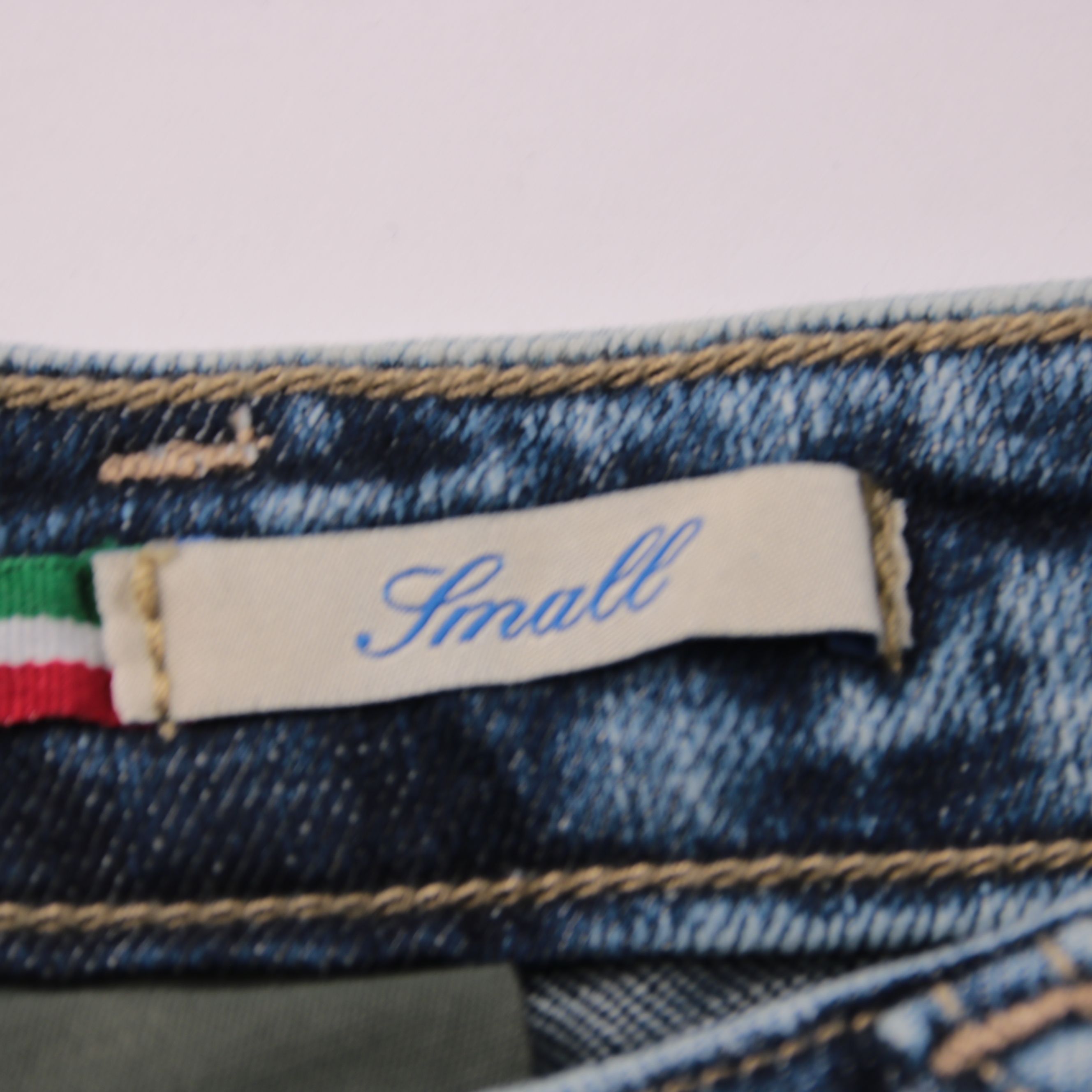 Женские джинсы Small из денима синего цвета с высокой посадкой и застёжкой на пуговицы. Подойдут для повседневных образов с футболками, рубашками и свитерами. Плотная джинса хорошо держит форму и комфортна в носке.