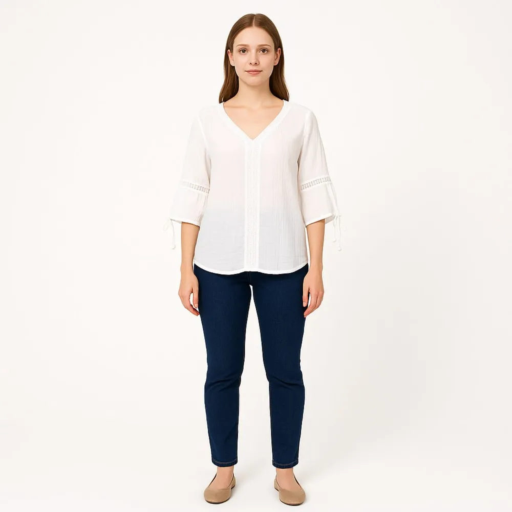 Женская белая майка на тонких бретелях, без указания бренда. Подойдёт для дома и сна, а также как базовый слой под рубашку или кардиган. Лёгкая и занимает минимум места, удобно брать в поездки.