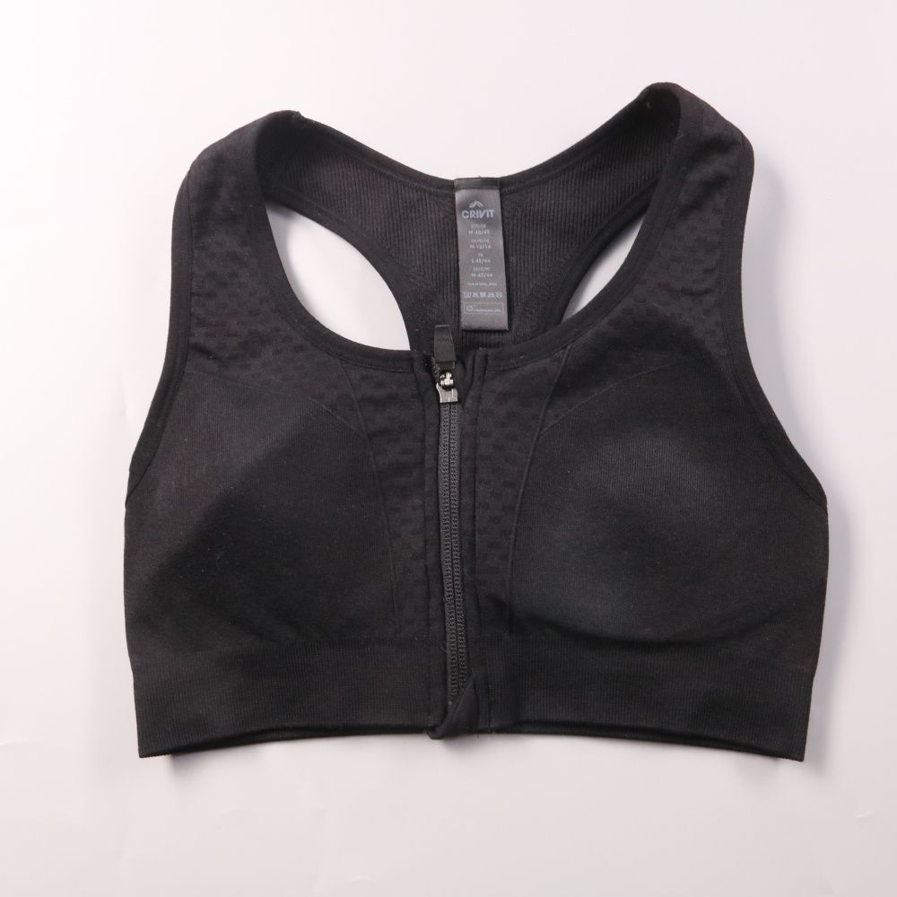 Спортивный топ Crivit чёрного цвета с молнией спереди и борцовской спинкой. Подойдёт для тренировок и активных прогулок, хорошо фиксируется и комфортно сидит. Практичный плюс — молния позволяет быстро надевать и снимать.