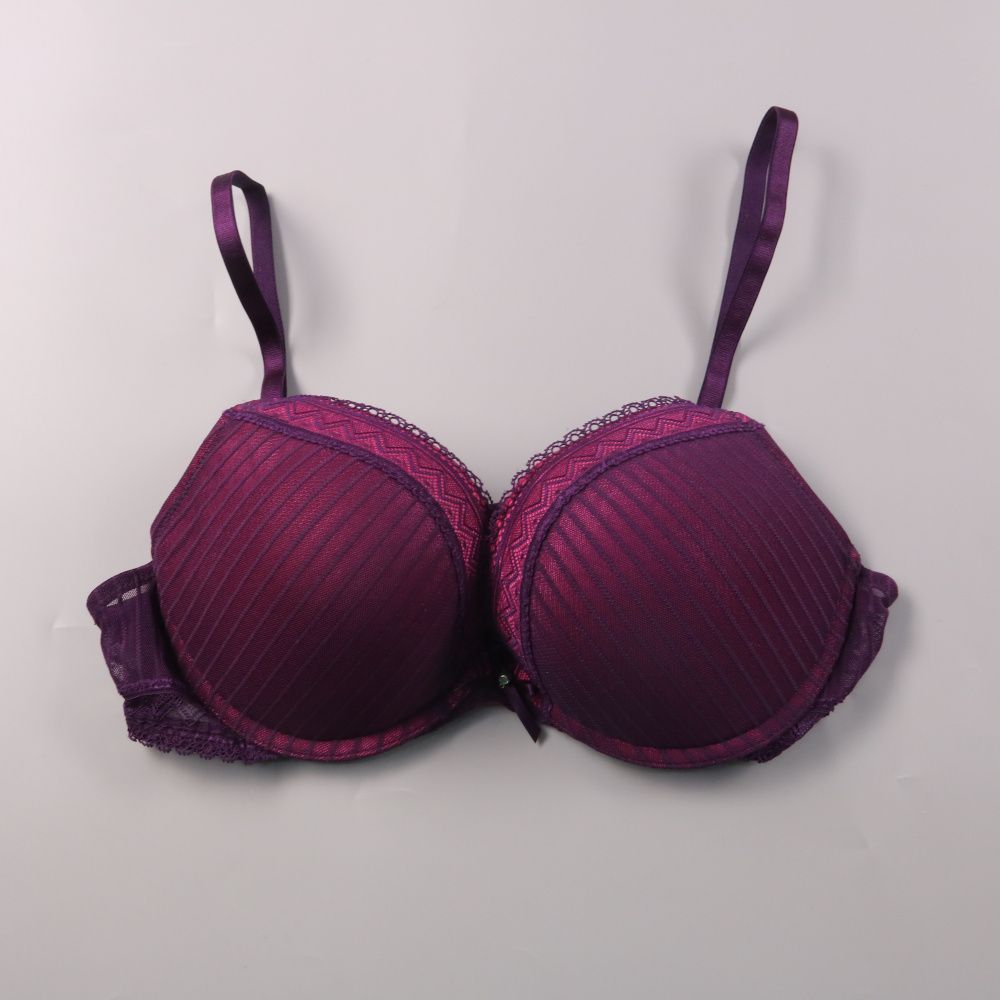 Бюстгальтер с формованными чашками и кружевной отделкой, цвет фиолетовый/бордовый. Подойдёт для повседневной носки, когда нужна поддержка и аккуратный силуэт под одеждой. Регулируемые бретели и застёжка на крючки сзади помогают удобнее подогнать посадку.