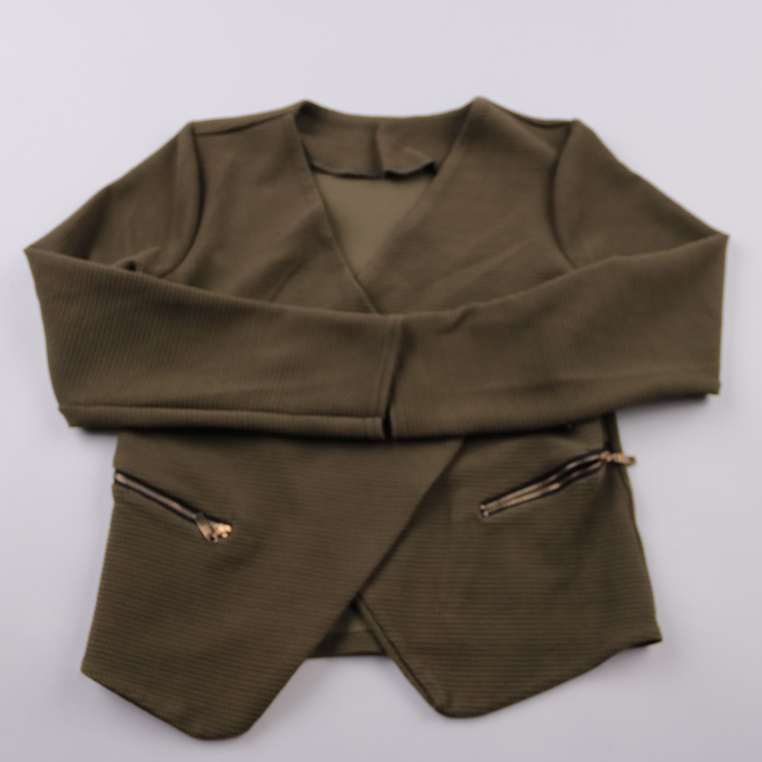 Женский укороченный пиджак без бренда в цвете хаки, с запахом и декоративными карманами на молниях. Подойдёт для офиса и повседневных образов, хорошо сочетается с брюками и юбками. Плотная фактурная ткань держит форму и выглядит аккуратно.
