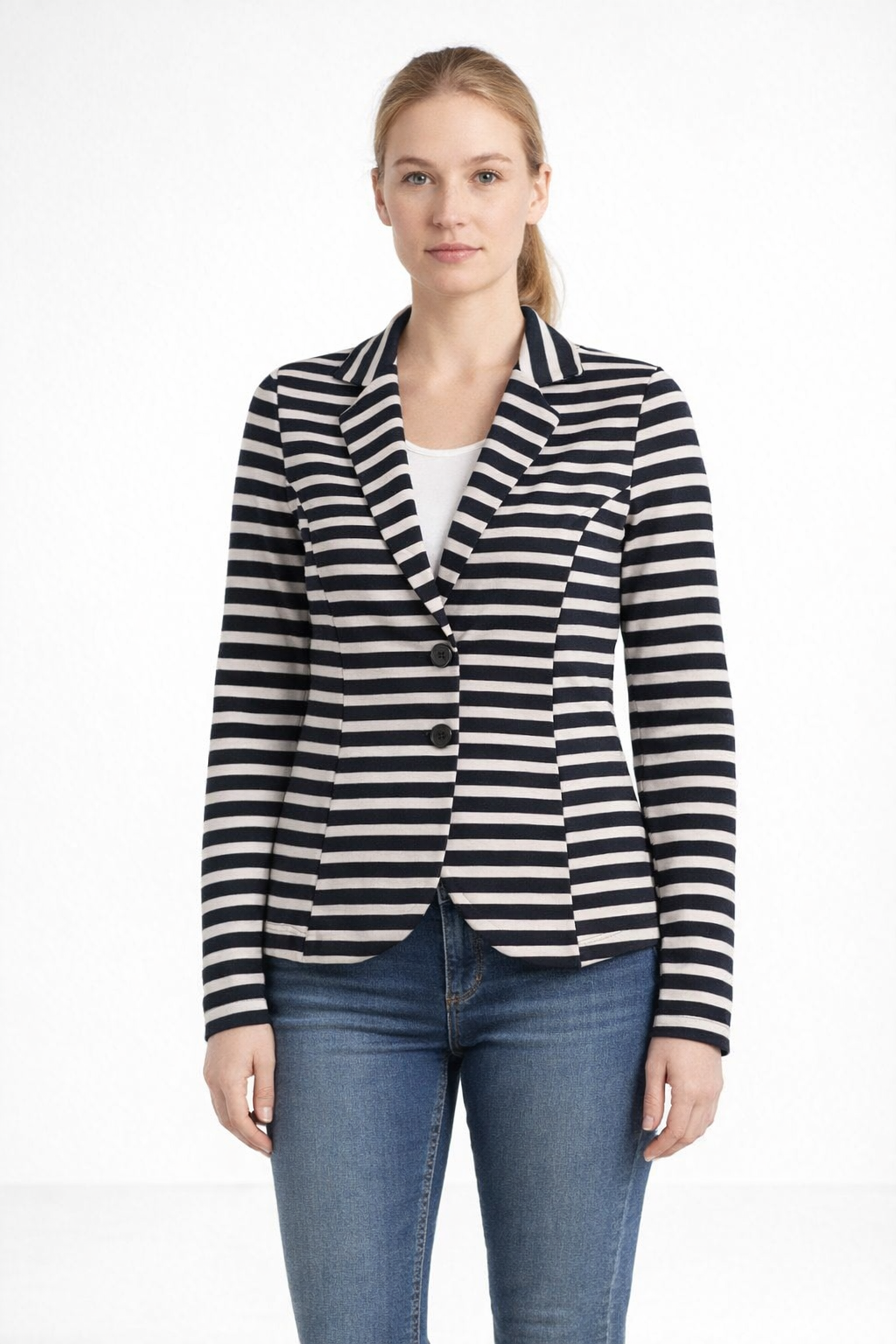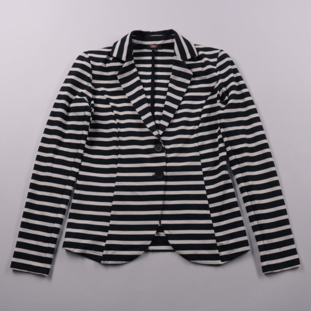 Женский пиджак Enjoy в чёрно-белую полоску, приталенный, на двух пуговицах и с отложным воротником. Подойдёт для офиса и повседневных образов с джинсами или однотонными брюками. Трикотажная ткань со стрейчем комфортно садится по фигуре и не сковывает д...
